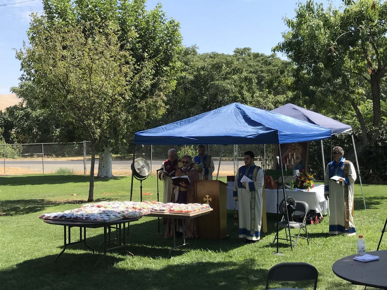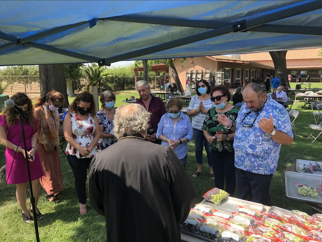 Fr. Vazken Movsesian has been appointed by the Primate to lead these pilgrimages. On the feast of Assumption, Fr. Vazken celebrated the Divine Liturgy and officiated at grape blessing service in Yettem. A group from the Diocese journeyed there for a spiritual pilgrimage to receive the blessings of the Holy Mother of God, Christ and His Church. Adapting to the conditions set forth by the COVID-19 pandemic, services were held outdoors, under tents and the trees. A special “pilgrim’s prayer” was offered by Fr. Vazken, focusing on the “ookhd” or the sacred vow made by the pilgrims for that day. The parishioners at St Mary, under the chairmanship of Myron Sheklian, welcomed the group in a most hospitable and gracious manner. The message of the day was not missed, as the grapes and God’s goodness were celebrated in the Garden “where it all began.”