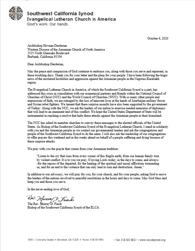 The Western Diocese has also received support from the Rev. Felix Villanueva, Conference Minister of the United Church of Christ of Southern California Nevada Conference who wrote to Archbishop Derderian that the United Church of Christ "stands in solidarity with the people of Artsakh (Nagorno Karabakh) and the Republic of Armenia. We are holding you and all our brethren there in our prayers."