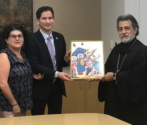 On June 4, 2021, His Eminence Archbishop Hovnan Derderian, accompanied by former Diocesan Council Chair and former Supreme Spiritual Council member Dr. Varoujan Altebarmakian, Fresno State Coordinator of Armenian Studies Barlow Der Mugrdechian, Professor of Armenian Studies Dr. Sergio La Porta, the Pastor of St. Gregory the Illuminator Armenian Church of Fowler the Rev. Fr. Gomidas Zohrabian and the Pastor of St. Paul Armenian Church of Fresno the Rev. Fr. Yessai Bedros met with Saúl Jiménez-Sandoval, Ph.D, the newly appointed President of California State University at Fresno and his spouse Dr. Mariana Anagnostopoulos.