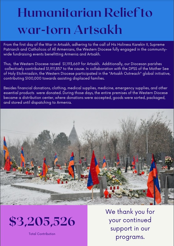 Moreover, as had been done in the past, the Western Diocese of the Armenian Church of North America, through the collective efforts of the faithful, continues to fulfill the humanitarian obligations entrusted to this venerable and God-oriented institution. Ensuring the livelihood and the prosperity of Armenia and Artsakh will continue to be among our top priorities.