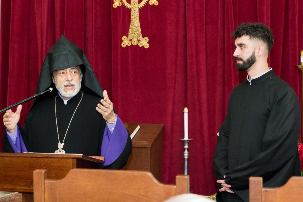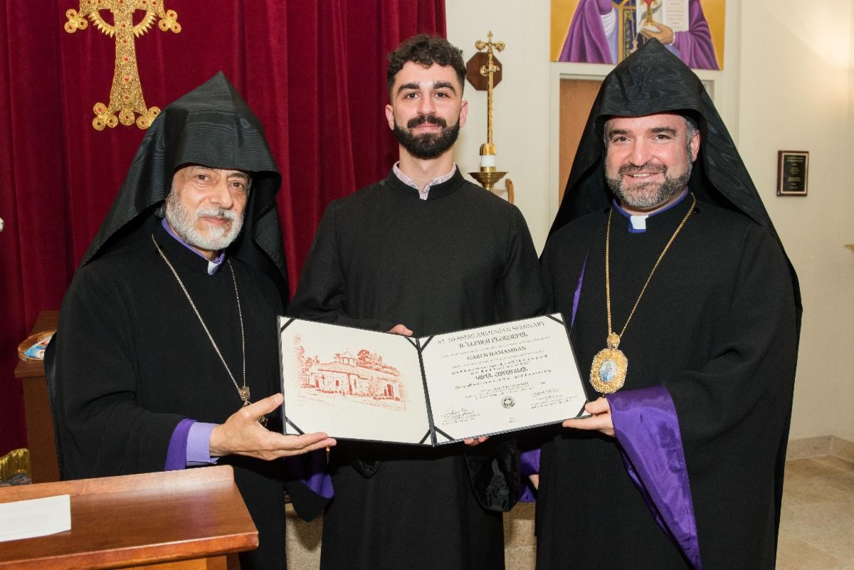 Before presenting the diploma, Archbishop Hovnan Derderian shared his observations about Dn. Garen. “This fine gentleman, standing in front of us, gifted with many talents and virtues, was a young boy when he made his strides at St. Leon Cathedral as an altar boy. Today, we celebrate his faithfulness, steadfastness, and perseverance. Despite facing numerous challenges, Garen remained focused and persevered until the end. His achievement is a tribute to the blessed memory of his late mother, beloved Ani Kelejian Hamamjian, who instilled the love for God and His holy church in the heart of his son.”