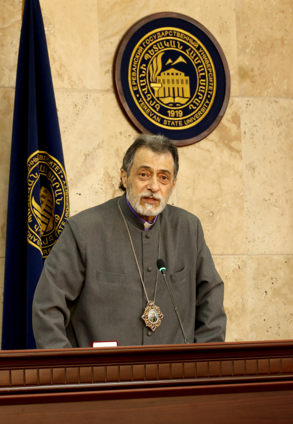 In the meeting hall of the YSU Academic Council, Archbishop Hovnan Derderian opened a gathering with YSU lecturers and studentsâincluding students from Artsakhâwith the Lordâs Prayer. Under his leadership, the Western Diocese of the Armenian Church has provided substantial assistance to Artsakh students, contributing to the continuity of their education.