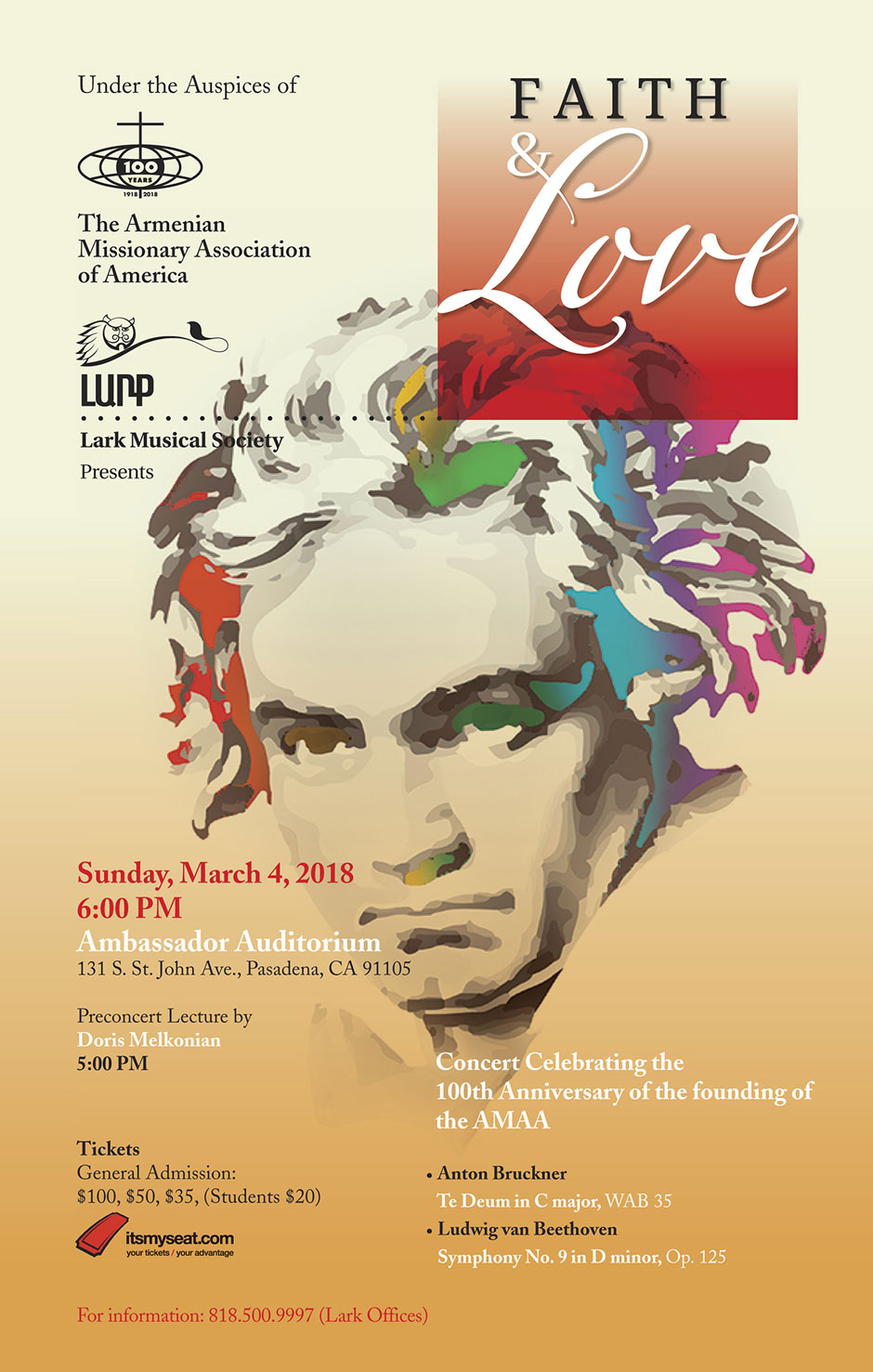 On Sunday, March 4, 2018, the Diocesan Primate attended Lark Musical Society’s concert dedicated to the Centennial of the Armenian Missionary Association of America. Titled “Faith and Love,” the unique concert was held at the Ambassador Auditorium in Pasadena.