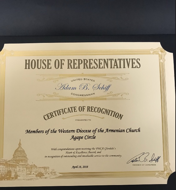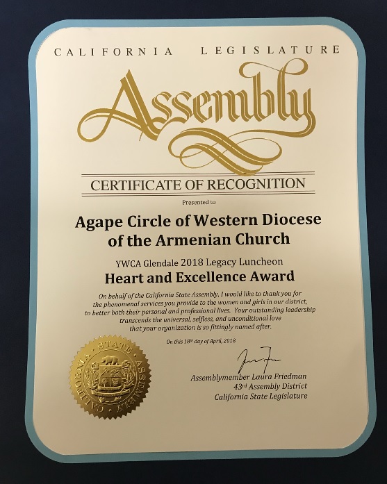 The ladies of the Agape Circle of the Western Diocese were honored with the Heart and Excellence Award at the 21st Annual YWCA Glendale Legacy Luncheon which was held on April 18, 2018 at the prestigious Vertigo Venue in Glendale.