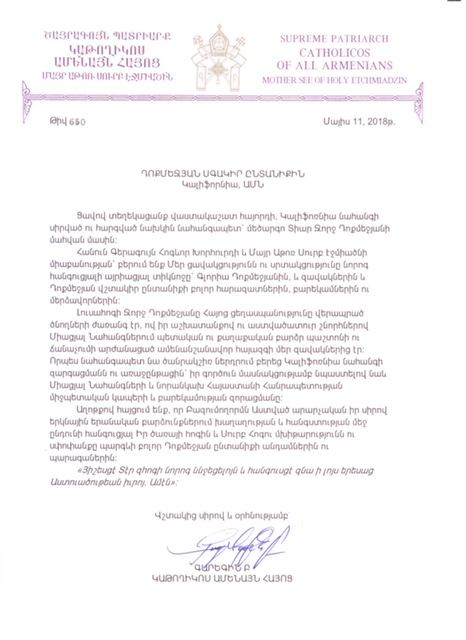 “The rich legacy of Governor George Deukmejian will forever linger in the hearts of the Armenian American community. As a visionary leader, he was a committed to a prosperous California. As a family man, he was compassionate and caring. As a man of humble character, he was a true follower of Christ.