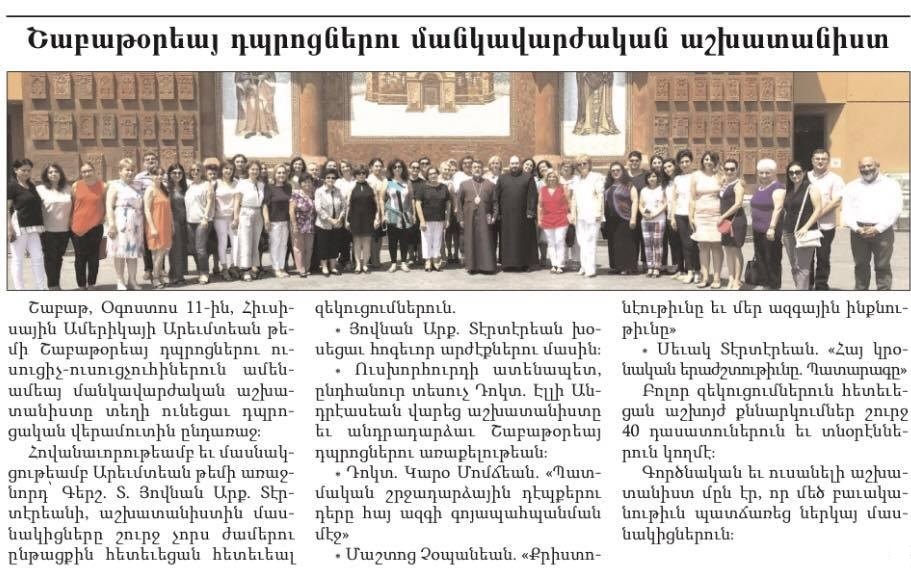 The annual Saturday School Teachers’ workshop organized by the Western Diocese of the Armenian Church of North America was held under the auspices of the Diocesan Primate on August 11, 2018 at the Hampar Family Room.