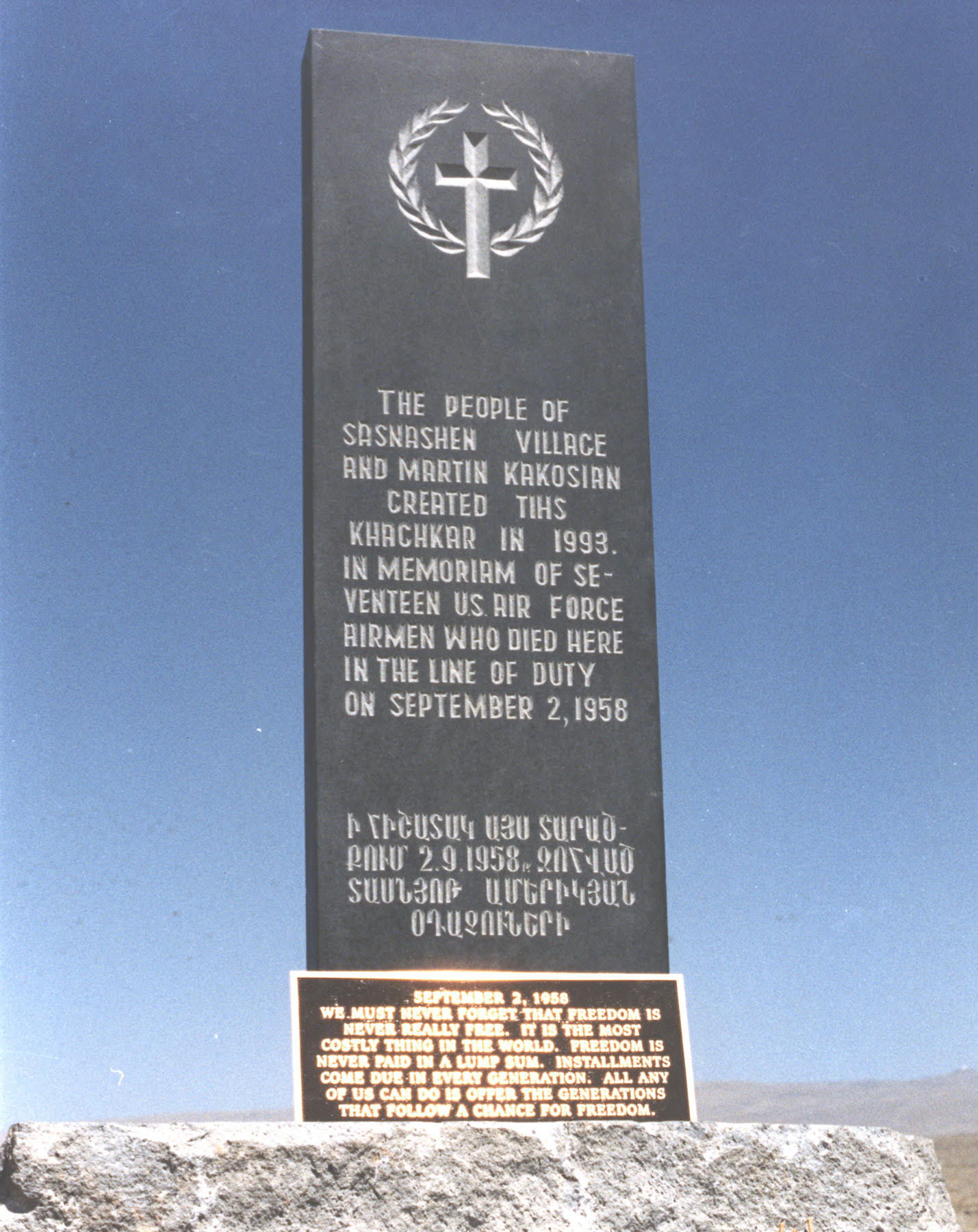 One of the eye-witnesses to the event was a young man, Martin Kakosian, a college student on a field trip in 1958. Kakosian, a skilled sculptor, later collaborated with the villagers to create a memorial â a khatchkarâ honoring an unknown American crew that had died unceremoniously at the edge of their village. In late August 1993, Sasnashen village commemorated the 35th anniversary of the shoot-down during the unveiling of the khachkar.