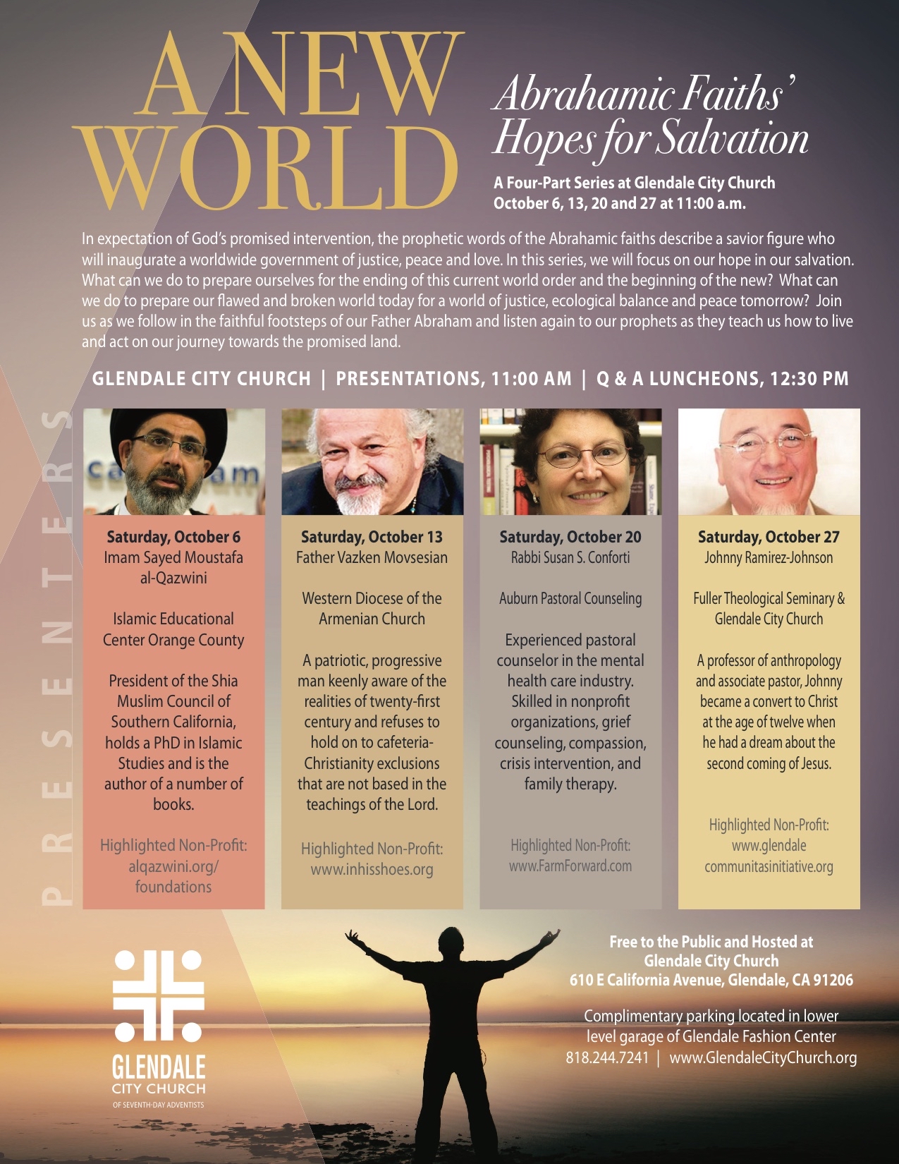 This Saturday, October 13, Fr. Vazken Movsesian will be the featured speaker at "A New World: Abrahamic Faiths' Hopes for Salvation" at the Glendale City Church, 610 E. California Ave, Glendale.Â