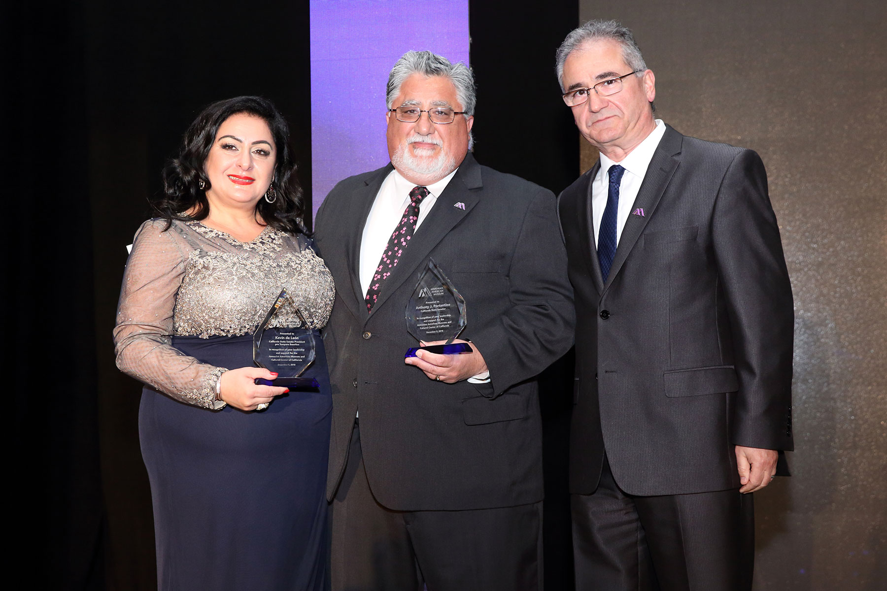 California State Senator Anthony J. Portantino and President pro Tempore Emeritus Kevin de León were honored for their leadership in securing an additional $3 million in funding for the Museum from the State of California, bringing the State’s total commitment for the landmark project to $4 million. “It is truly an honor to represent the Armenian American community in the State Senate and support a museum and cultural center that will serve and complement our rich California Armenian tapestry,” stated Senator Portantino. President pro Tempore Emeritus Kevin de León attended the Gala and expressed his appreciation to Museum representatives and attendees as well. The awards were presented by Museum Board of Trustees Secretary Ani Bostanian representing the Armenian Relief Society Western USA and Dr. Raffi Balian representing the Nor Or Charitable Foundation.