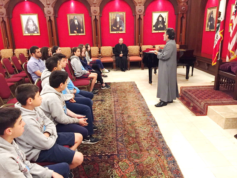 On March 26, 2019, the Diocesan Primate welcomed Mr. Shahe Mankerian and the 8th grade students of Alfred and Marguerite Hovsepian School to the Western Diocese. In a cordial meeting with His Eminence Archbishop Hovnan Derderian, the students took part in an informative and educational question and answer session. Archbishop Derderian also encouraged the students to remain loyal to the sacred Christian values which we commonly hold in reverence and to strive to become exemplary Christians in our community.