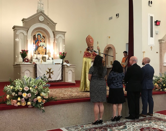 His Eminence Archbishop Hovnan Derderian, Primate of the Western Diocese of the Armenian Church of North America celebrated the Divine Liturgy at St. Gregory the Illuminator Armenian Church of Pasadena on Sunday, July 21, 2019. During the service, Mr. Avedis Markarian and his family were led on a processional through the church sanctuary by the Very Rev. Fr. Dajad Dz. V. Yardemian who carried the Pontifical Encyclical of His Holiness Karekin II, Supreme Patriarch and Catholicos of All Armenians in a silver tray. From the Holy Altar, the Encyclical was read to the parishioners by Fr. Dajad Yardemian. Presenting the Encyclical and the St. Nerses Shnorhali medal to the honoree.