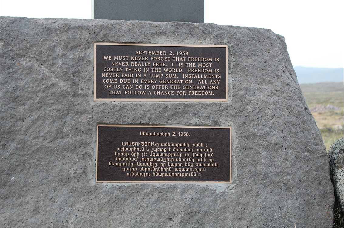 In 1958 – during the height of the Cold War – a United States Air Force C-130 flying a reconnaissance mission on the Turkish/Armenian border was shot down by the Soviets. The plane crashed in the village of Sasnashen, Armenia and lost its entire crew of 17 servicemen. The Soviets did not admit to the severity of the tragedy until after the fall of the USSR and by 1992 – some 34 years after the incident – the remains of all 17 men were returned to the United States for proper recognition and committal. Since that time commemorations have been taken place, including the placing of a khatchkar (cross stone) and a monument at the crash site with visits by U.S. military and government officials.