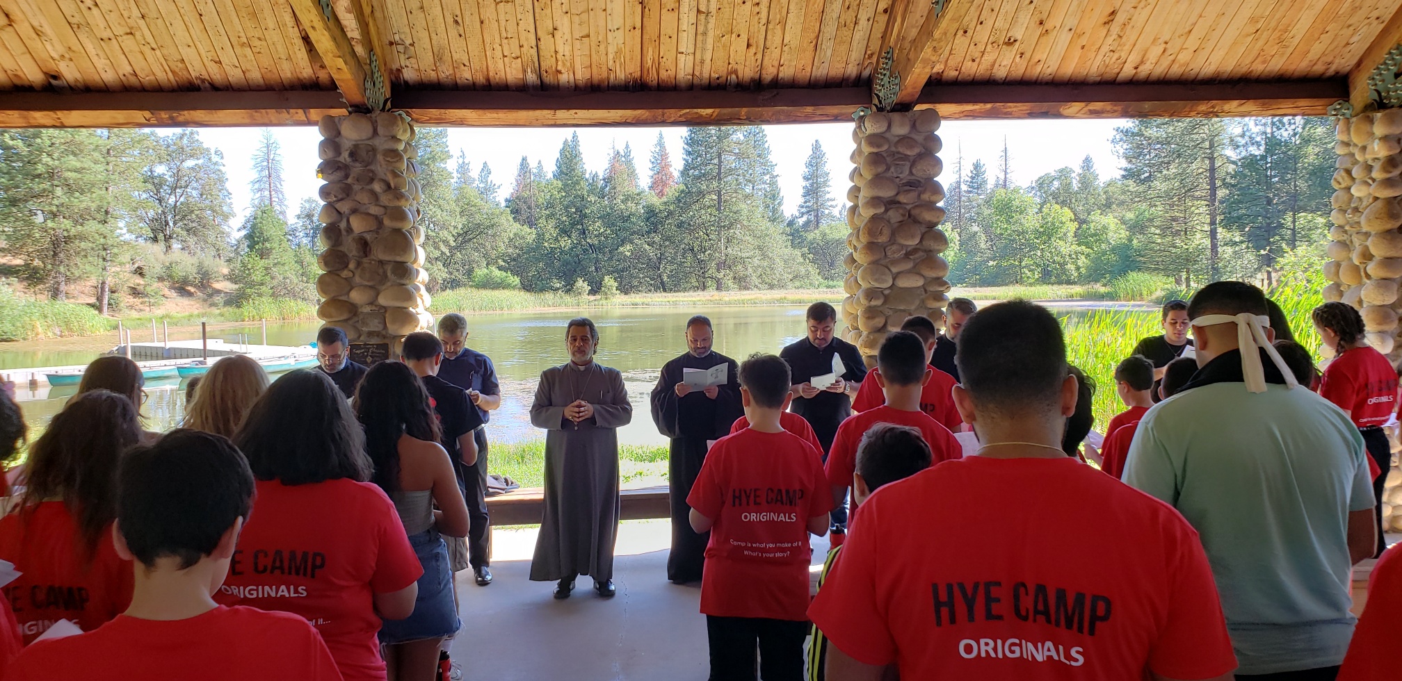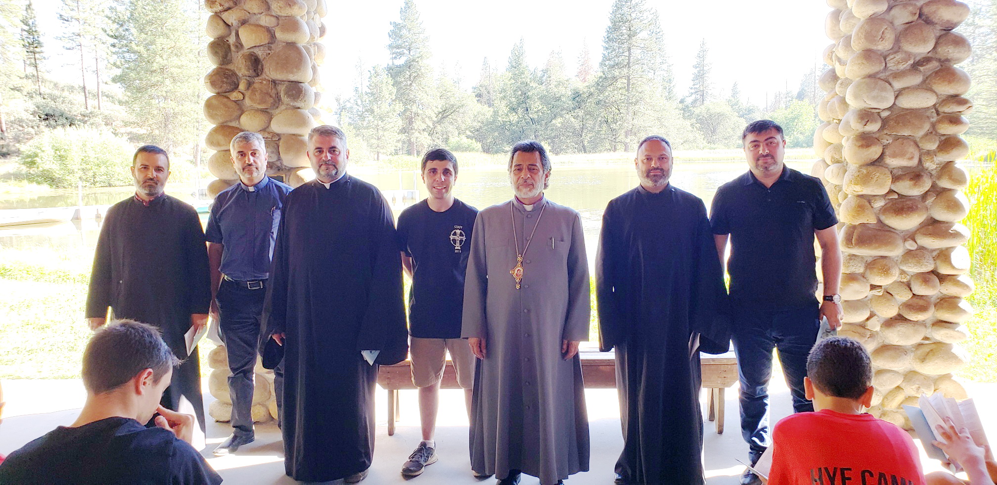 Accompanied by the Very Rev. Fr. Zacharia Baghumyan, Director of the Bishops’ Synod’s Office of the Mother See of Holy Etchmiadzin, the Rev. Fr. Khajag Shahbazyan and two young students from Armenia, His Eminence Archbishop Hovnan Derderian, Primate of the Western Diocese of the Armenian Church of North America visited the campers at Hye Camp this week.
