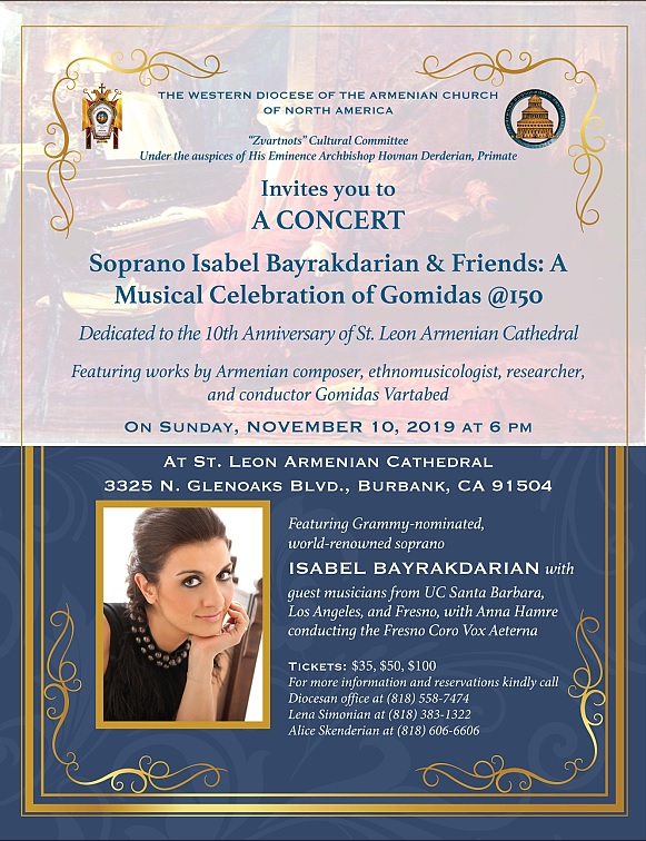 “ZVARTNOTS” Cultural Committee will present a special event, “Soprano Isabel Bayrakdarian & Friends: A Musical Celebration of Gomidas @150,” featuring the works of Armenian composer, priest, ethnomusicologist, arranger, researcher, and choirmaster Gomidas Vartabed on Saturday, November 10, 2019 at 6 pm at St. Leon Armenian Cathedral (3325 N. Glenoaks Blvd., Burbank, CA). The program will include performances by Grammy Award-nominated soprano Isabel Bayrakdarian and musicians from Los Angeles, Fresno, and UC Santa Barbara, along with Anna Hamre who will conduct the Fresno Coro Vox Aeterna.