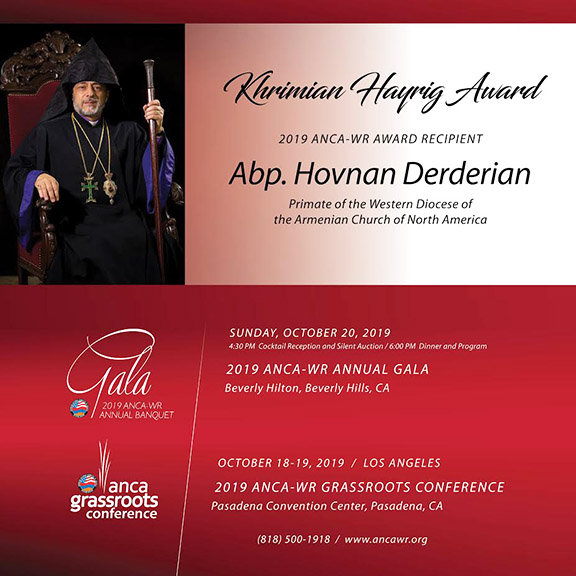 The Armenian National Committee of America – Western Region announced that His Eminence Archbishop Hovnan Derderian, Primate of the Western Diocese of the Armenian Church of North America will be honored with the Khrimian Hayrig Award at this year’s Annual Gala Banquet. The gala will take place on Sunday, October 20, at the Beverly Hilton in Beverly Hills, CA.
