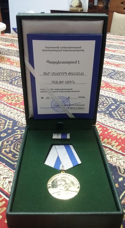 On January 28, 2020, in celebration of the Armed Forces Day, the Rev. Fr. Mesrop Ash, pastor of Saint John Armenian Apostolic Church of San Francisco, was honored with the prestigious “Andranik Ozanyan” Medal for providing unconditional support and humanitarian efforts towards the betterment of the Armed Forces Chaplaincy, the soldiers and their families.