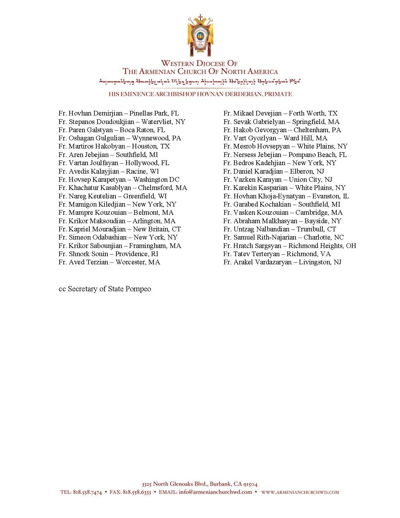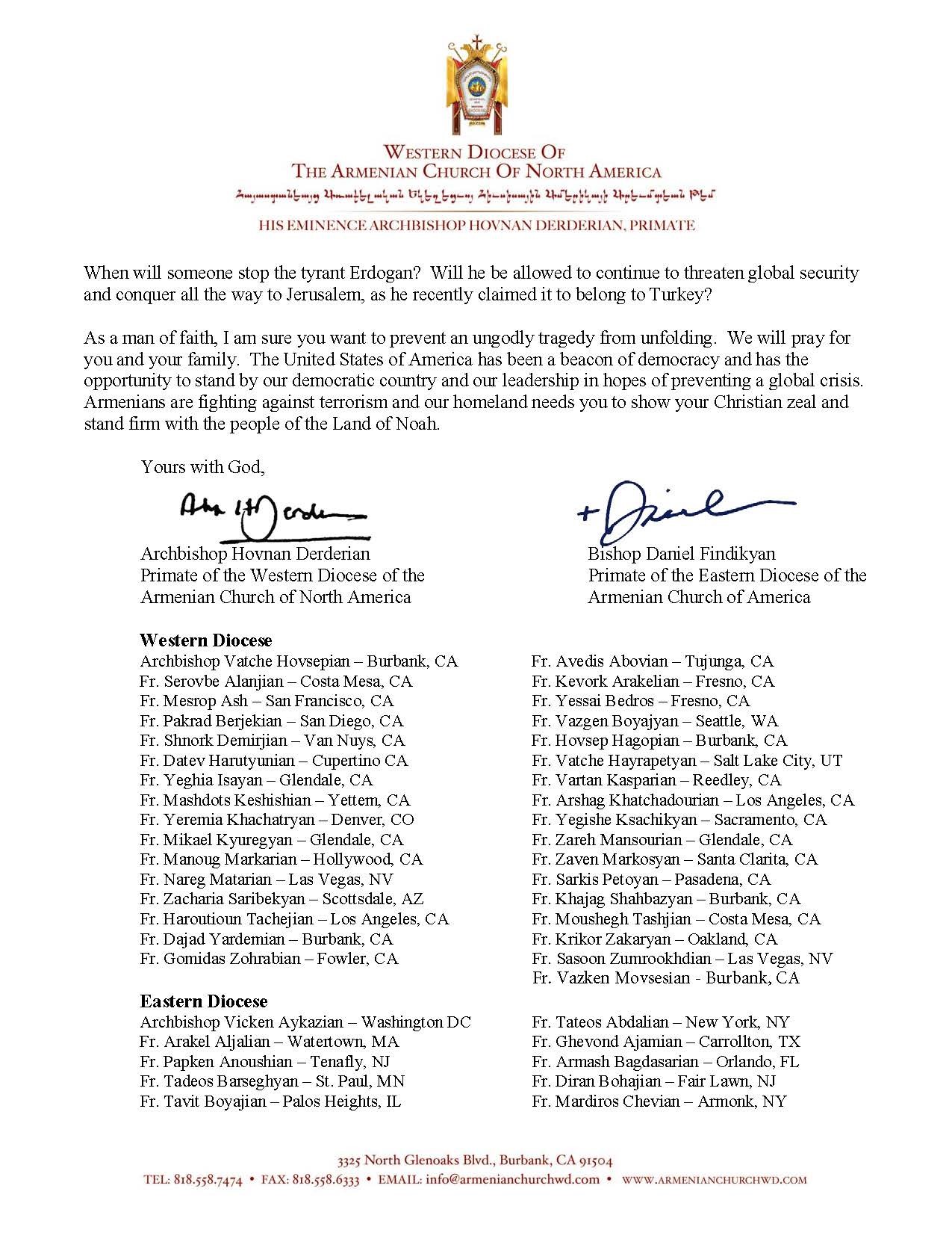 In a letter addressed to President Donald Trump dated October 8, the Primates and the reverend clergy of the Eastern and Western Dioceses of the Armenian Church of North America urged the President "to intervene and save the innocent people of Artsakh from Azeri and Turkish aggression."Â Â