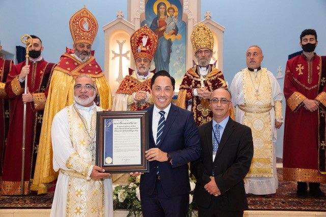 The Hon. Todd Gloria, Mayor of San Diego, awarding Proclamation to Very Rev. Fr. Pakrad Dz. V. Berjekian and Parish Council Chairman Yerevan Ohannessian
