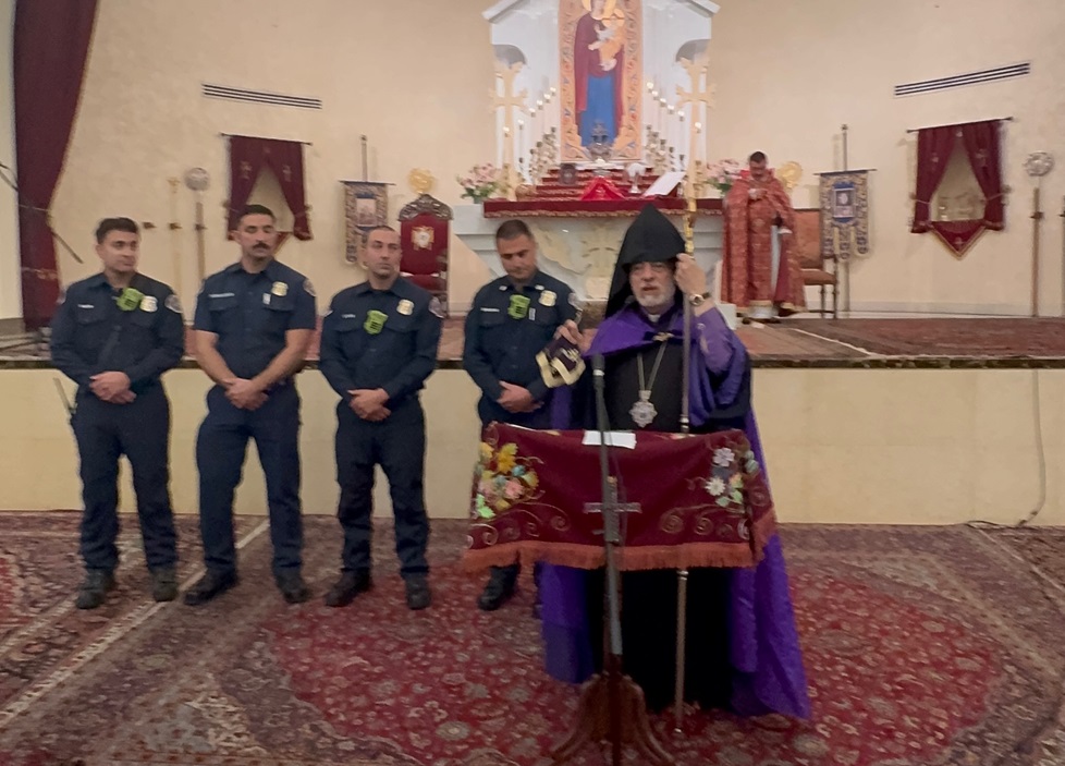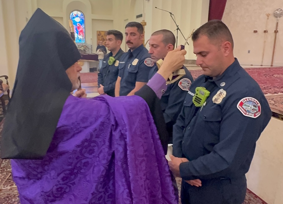 Four firefighters including Captain Narek Babayan, Engineer Greg Blikian, firefighter Vatche Margoussian and firefighter Shant Barin were honored by the Diocesan Primate Archbishop Hovnan Derderian on Sunday, May 4, 2025 during the celebration of the Divine Liturgy at St. Leon (Ghevontiants) Armenian Cathedral in Burbank.