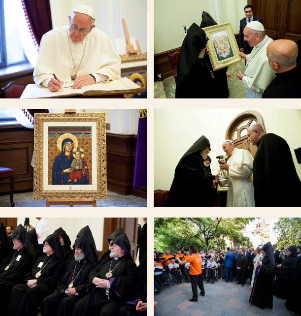 On the occasion of the visit, the Catholicos of All Armenians presented a Liturgical Chalice to Pope Francis, on which the St. Peter Basillica of the Vatican and the Mother Cathedral of Holy Etchmiadzin were engraved on the sides of the cup, as well as the holy apostles of the two churches. His Holiness also presented an icon of the Holy Martyr’s of the Armenian Genocide and a miniature sculpture of the Pope. In turn, the Pope gifted to His Holiness a mosaic of the Holy Mother of God.