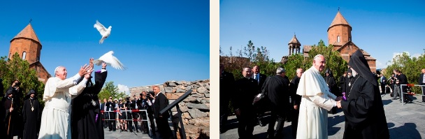 Following the brief service, the Patriarchs moved to an outdoor platform overlooking the biblical Mount Ararat, where as a sign of peace, two doves were released towards the closed Armenian-Turkish border.