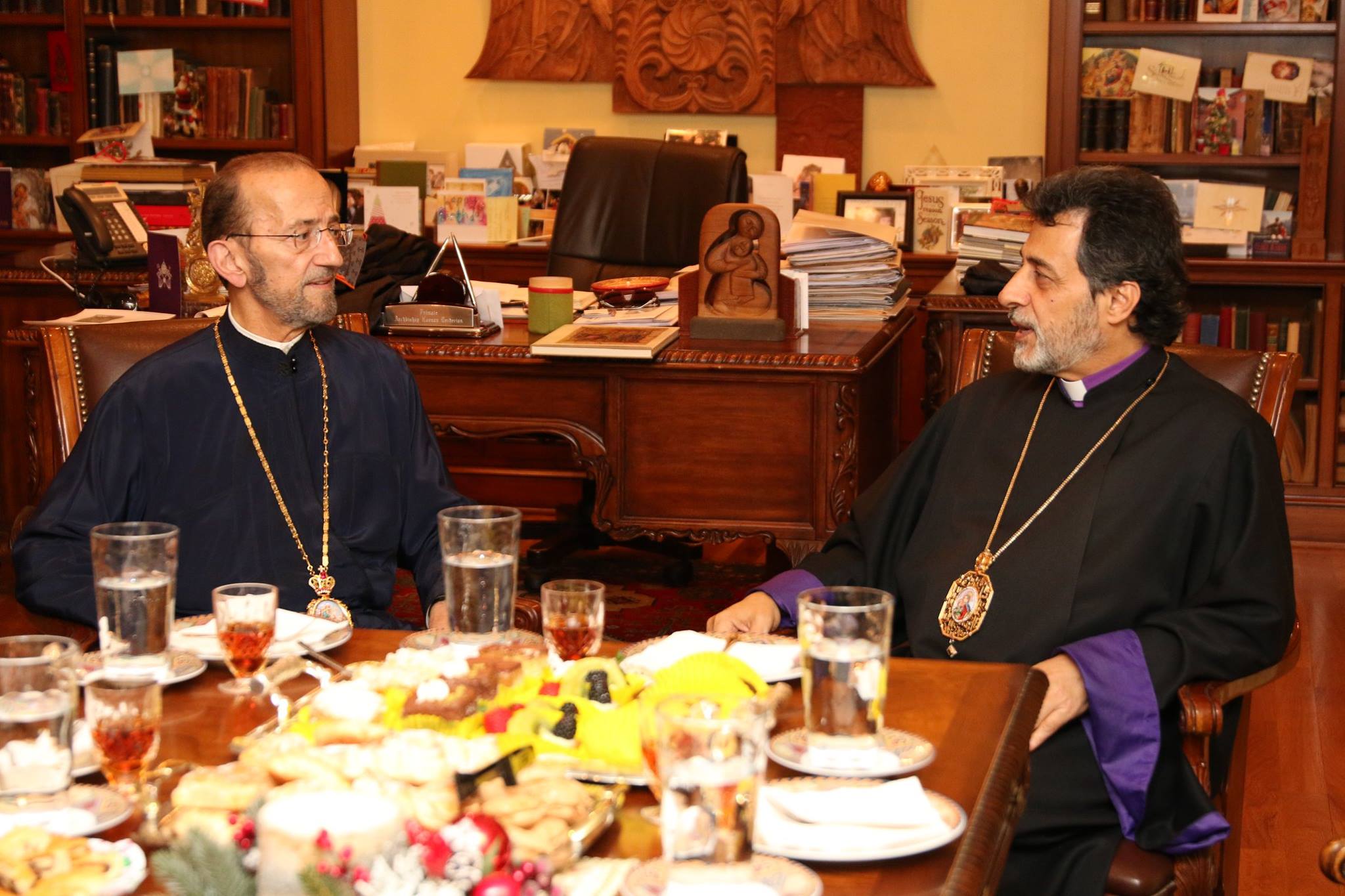 In efforts to solidify the ecumenical bond between the Armenian and Greek communities, on January 7, 2016, the Day of the Feast of the Nativity of Christ in accordance to the Greek Orthodox Church calendar, the Diocesan Primate Archbishop Hovnan Derderian welcomed His Eminence Metropolitan Gerasimos, the Bishop of the Greek Metropolis of San Francisco to the Diocesan Headquarters in Burbank. Archbishop Derderian was accompanied by Diocesan clergy the Very Rev. Fr. Dajad Dz. V. Yardemian, Archpriest Fr. Arshag Khatchadourian, Rev. Fr. Vazken Movsesian, the Rev. Fr. Khajag Shahbazyan and the Rev. Fr. Nerses Hayrapetyan.Â