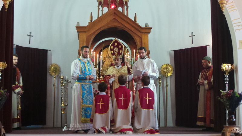 His Eminence was assisted at the Holy Altar by Rev. Fr. Nerses Hayrapetian, Pastor of the host parish and the Very Rev. Fr. Yeremia Abgaryan, the newest priest at the Western Diocese. Dcn. Jirayr Chadergian, Dcn. Yerevan Ohannesian, Sub Deacon Levon Parsegov, and Acolytes Kail, Karse, and Kyan Klijian also served at the Holy Altar. At the recommendation of Fr. Nerses, Kail, Karse, and Kyan Klijian were granted the order of stole-bearer by Archbishop Derderian. To the sheer delight of the parishioners, the sanctuary was filled by the gracious presence of Sunday School students and teachers who were warmly welcomed and acknowledged by the spiritual leader of the Western Diocese.