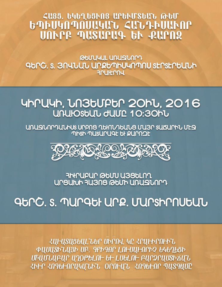 At the invitation of the Diocesan Primate, on November 20, 2016 at 10:30 a.m., His Eminence Archbishop Pargev Martirosyan, Primate of the Diocese of Artsakh, will celebrate the Divine Liturgy at the St. Leon (Srbots Ghevontiants) Armenian Cathedral.