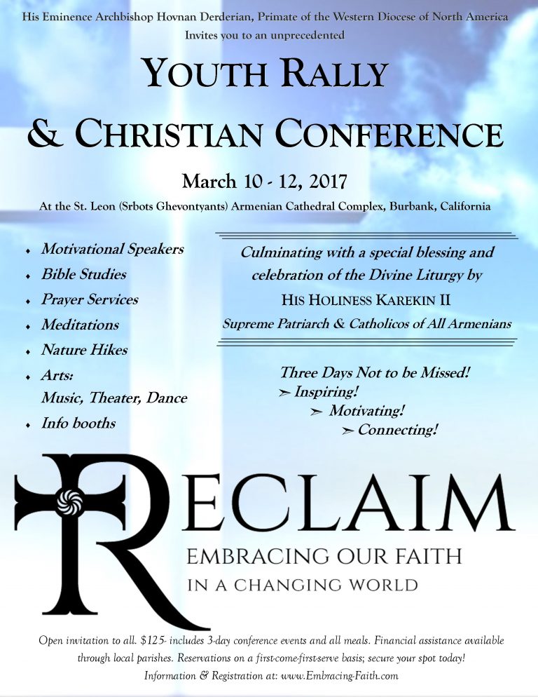 The Western Diocese of the Armenian Church, under the leadership of Archbishop Hovnan Derderian, Primate, is pleased to announce a Youth Rally and Christian Conference to take place March 10, 11 and 12 at the diocesan headquarters.