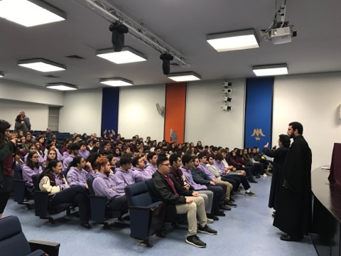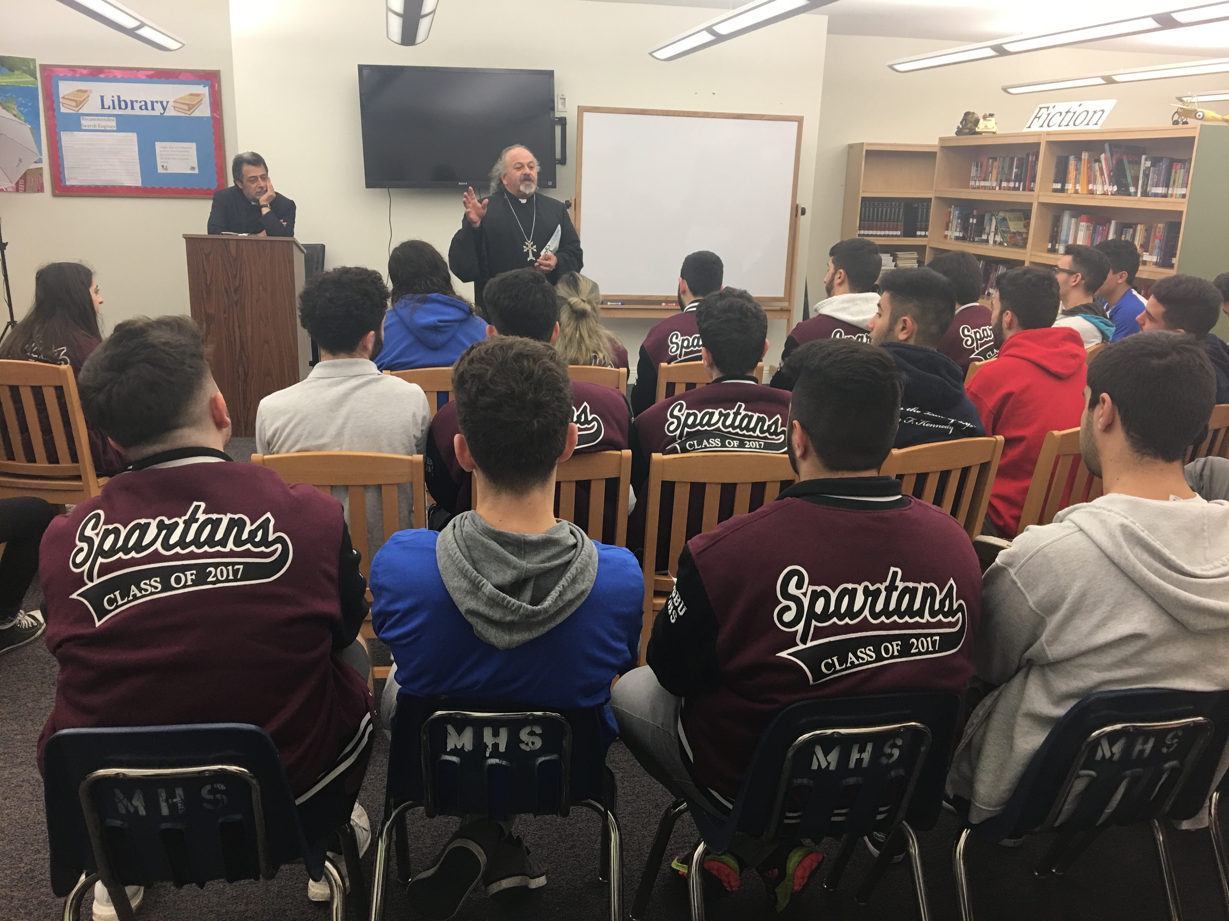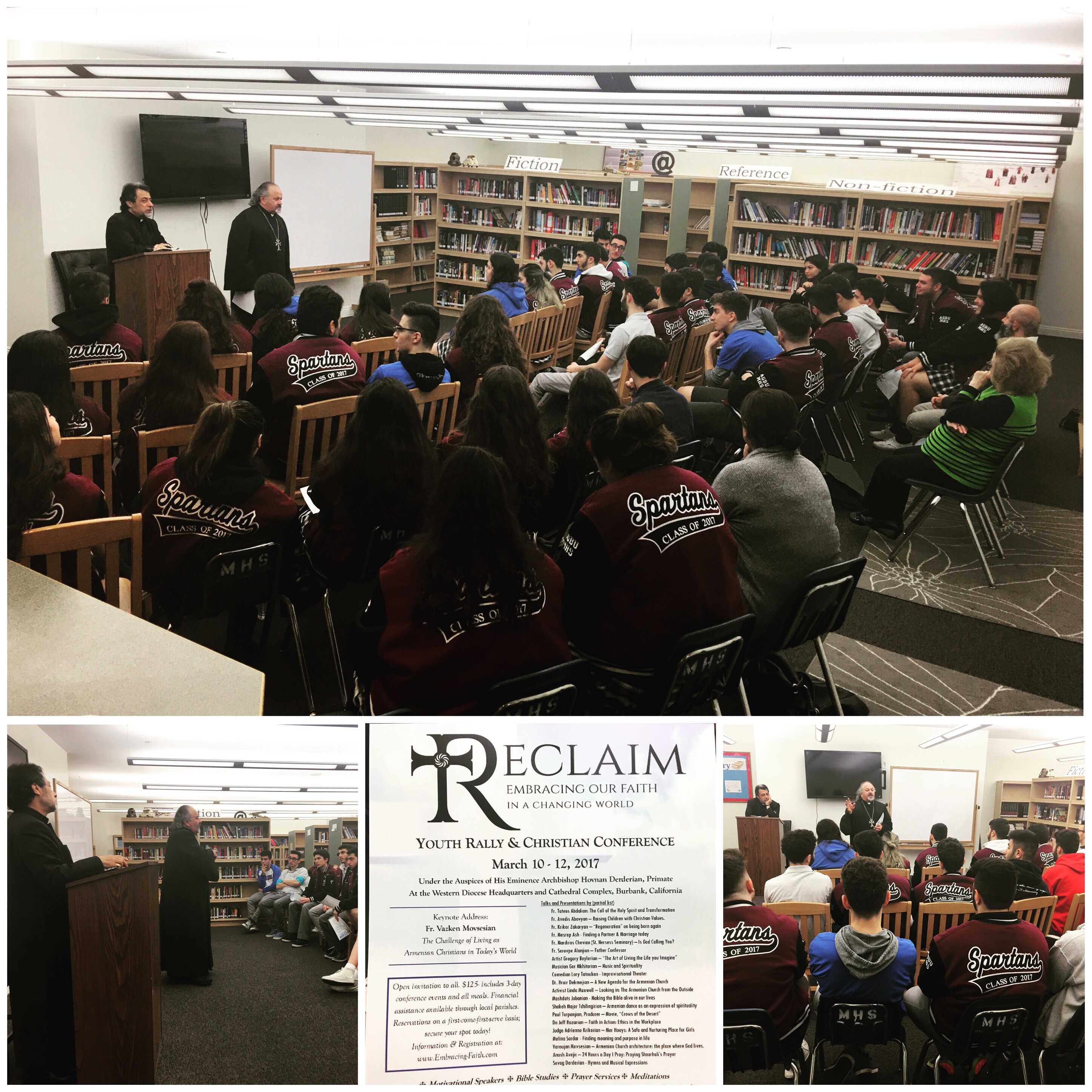 On the Wednesday morning, the Primate, accompanied by the Rev. Fr. Vazken Movsesian and Archpriest Fr. Sarkis Petoyan visited the students of Alfred and Marguerite Hovsepian School in Pasadena to deliver the day's homily and encourage the participation of the youth in the upcoming Youth Conference and Rally in March.Â