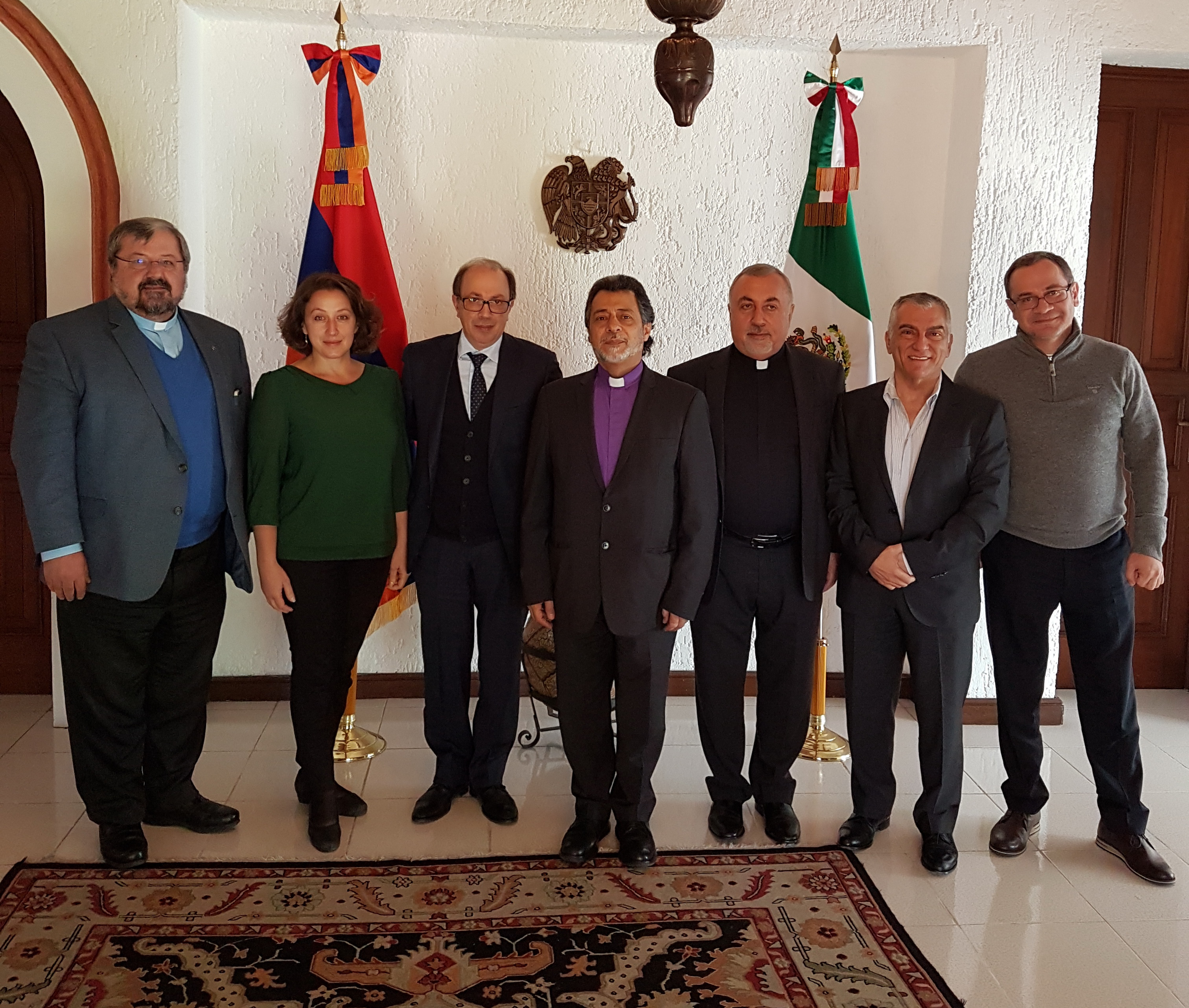 On January 14, 2017, His Eminence Archbishop Hovnan Derderian paid a pastoral visit to the Armenian-Mexican community in Mexico City. His Eminence was accompanied by the Very Rev. Fr. Sasoon Dz. V. Zumrookhdian, Archpriest Fr. Manoug Markarian and Mr. Asadour Sarafian.  In the evening, a welcoming reception was graciously hosted by the Armenian Ambassador to Mexico His Excellency Ara Ayvazyan. In his remarks, Ambassador Ayvazyan expressed his gratitude to the Primate for the pastoral guidance of the Mexican-Armenian community noting his positive impact on the community since his first visit.