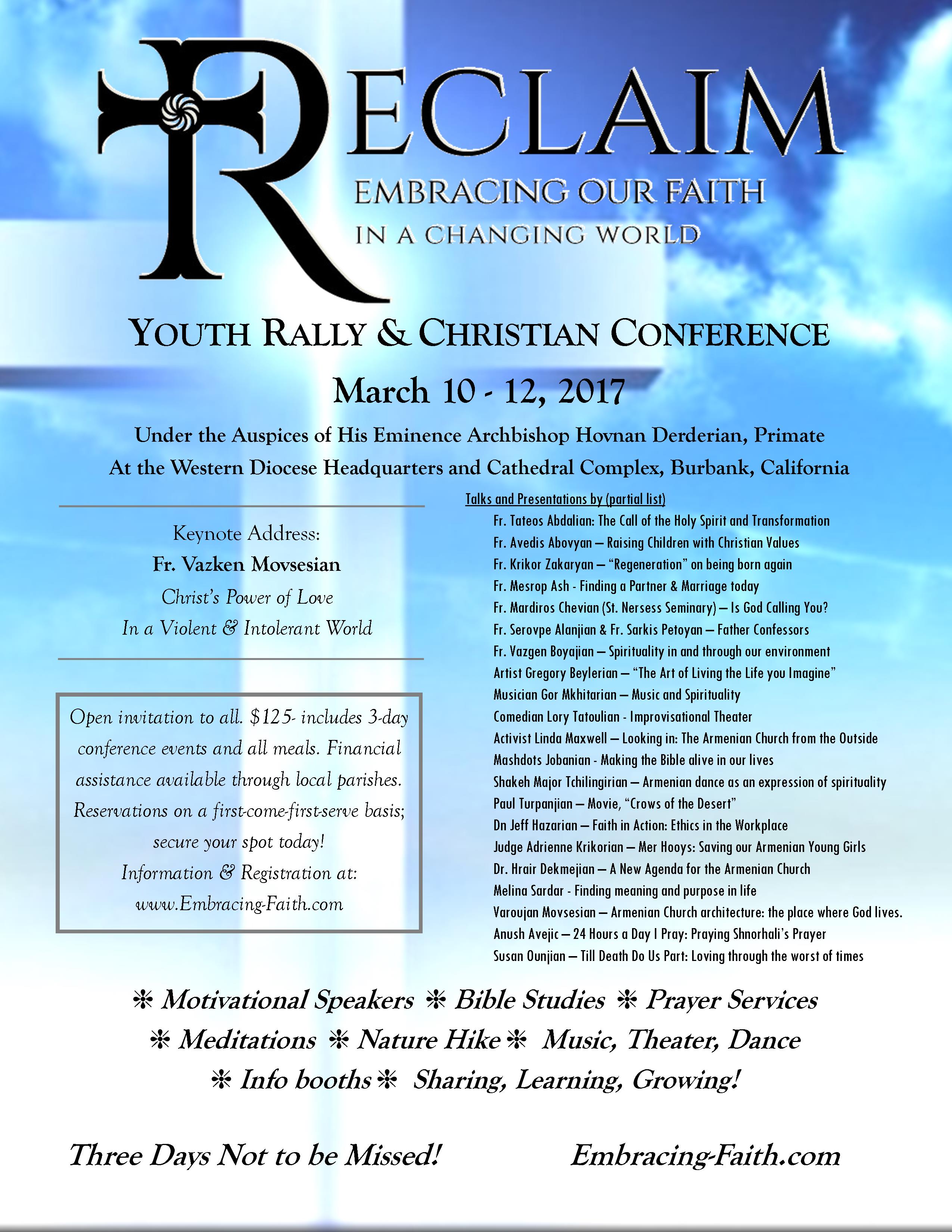 According to event organizer, Fr. Vazken Movsesian, “We’re calling the Conference ‘Reclaim.’ Given the rapid changes in the world, the Armenian Apostolic Church offers a time-proven tradition of victory through faith in Jesus Christ. We seldom remember how powerful that is. With our classes and presentations, that is exactly what we need to reclaim.”