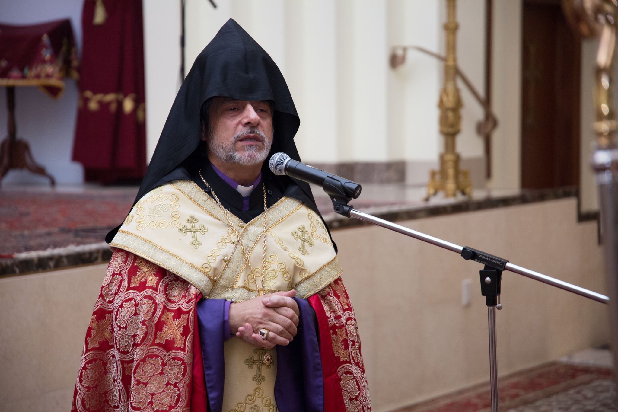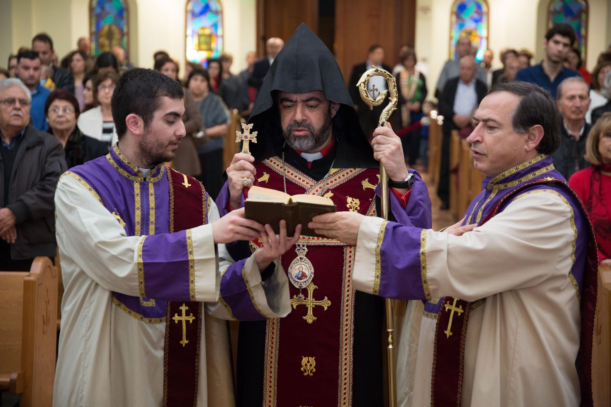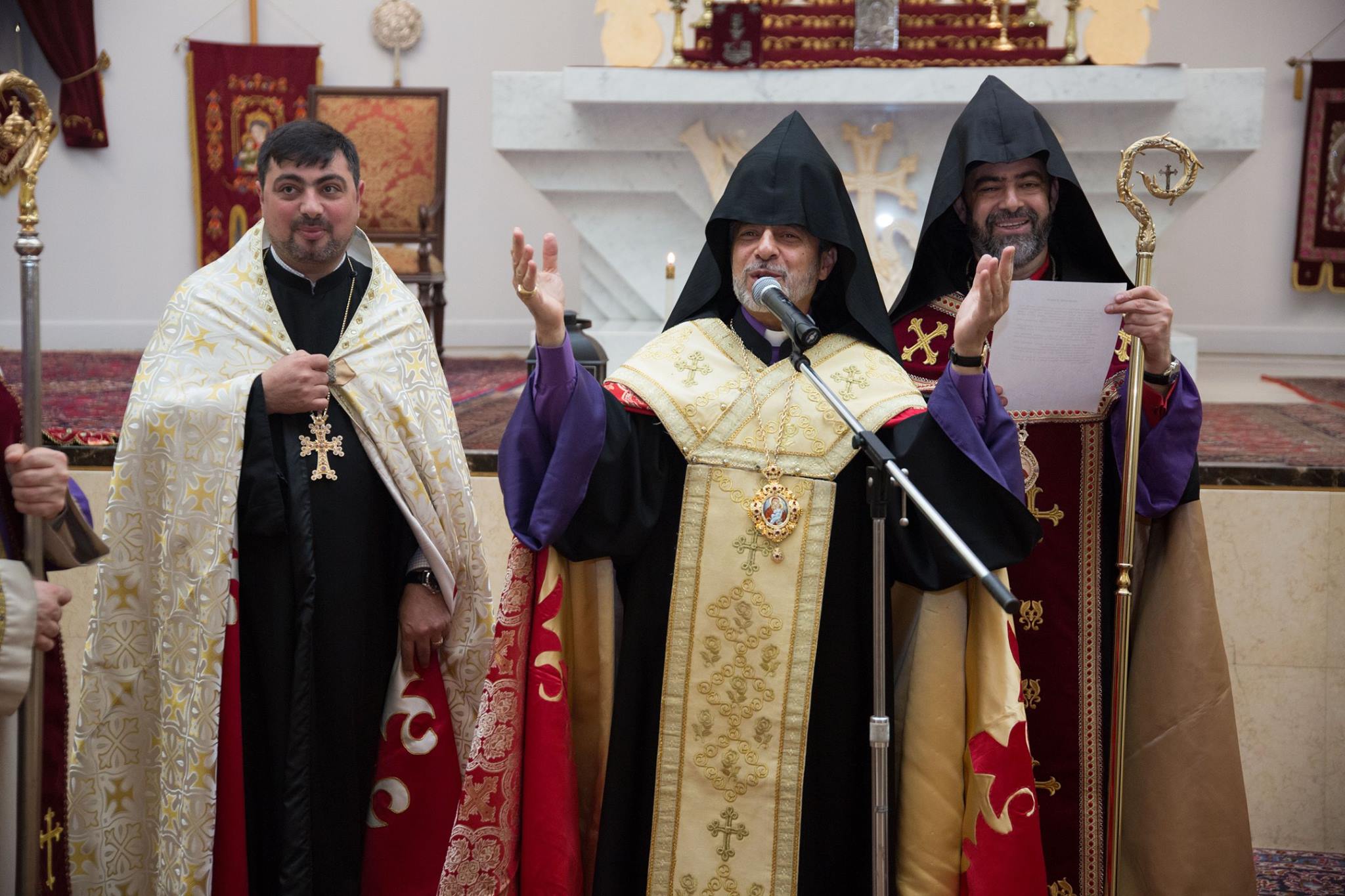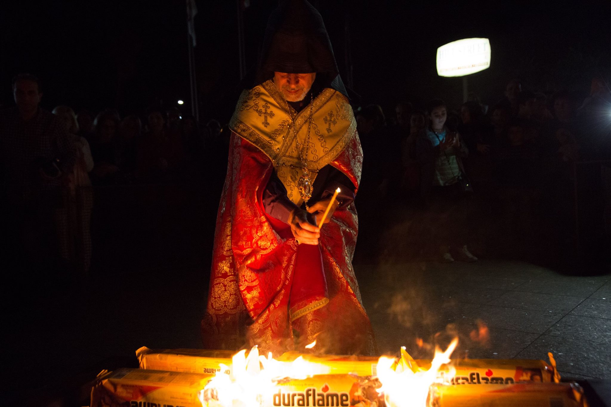 On February 13, 2017, the eve of the feast, at 6:00 p.m., the Diocesan Primate presided over the Dyuarnuntarch service at St. Leon Armenian Cathedral. Clergy of the greater Los Angeles area including visiting bishop from Armenia His Grace Bp. Sion Adamyan participated in the service. Following the traditional blessing of the Four Corners of the World, Andastan, the clergy led a processional to the Turpanjian Plaza for the lighting of the bonfire, symbolizing the Light and Wisdom of Christ.