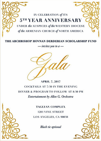 The 5th anniversary celebration of the Archbishop Hovnan Derderian Scholarship Fund will be held on Friday, April 7, 2017 at the prestigious Taglyan Cultural Center in the heart of Hollywood.