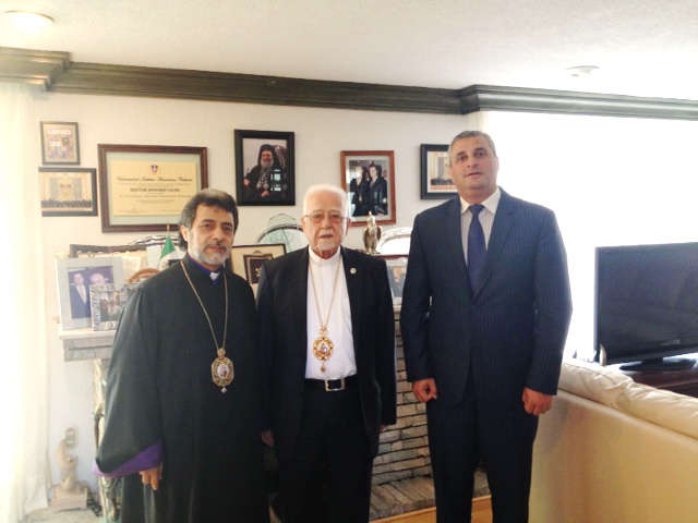 (Caption left to right: H.E. Abp. Hovnan Derderian, Primate of the Western Diocese of the Armenian Church of North America and Mexico, H.E. Abp. Antonio Chedraui Tannous, Archbishop of the Antiochian Orthodox Archdiocese of Mexico, Central America, Venezuela and Caribbean Islands, His Excellency Grigor Hovhannisyan, former Ambassador of the Republic of Armenia to Mexico (Mexico City, Mexico - August 2014)