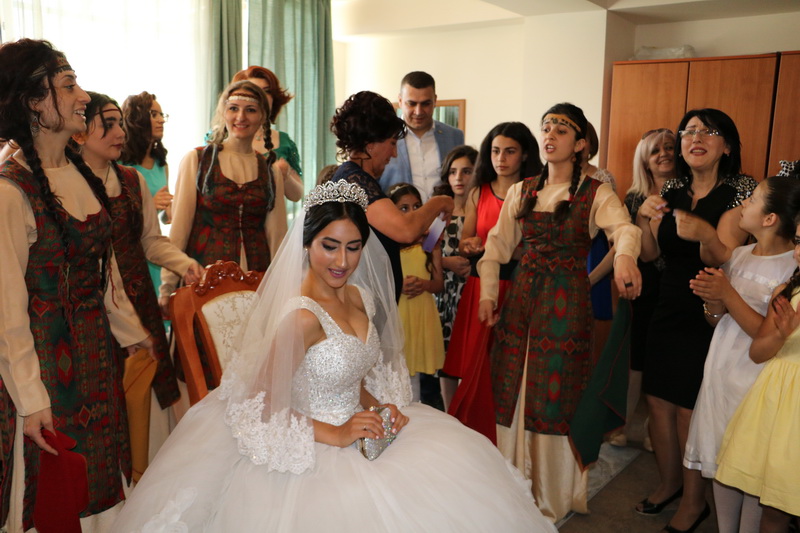 The bride dressed in the graduate apartment of the transitional program at the Nakashian Children’s Support Center.  Program staff and her Mer Hooys sisters from the first and second classes participated in the wedding preparations. In traditional Armenian style, the bride sat while serenaded by musicians and young women in traditional costumes, and the groom's mother, sister and immediate family. Â