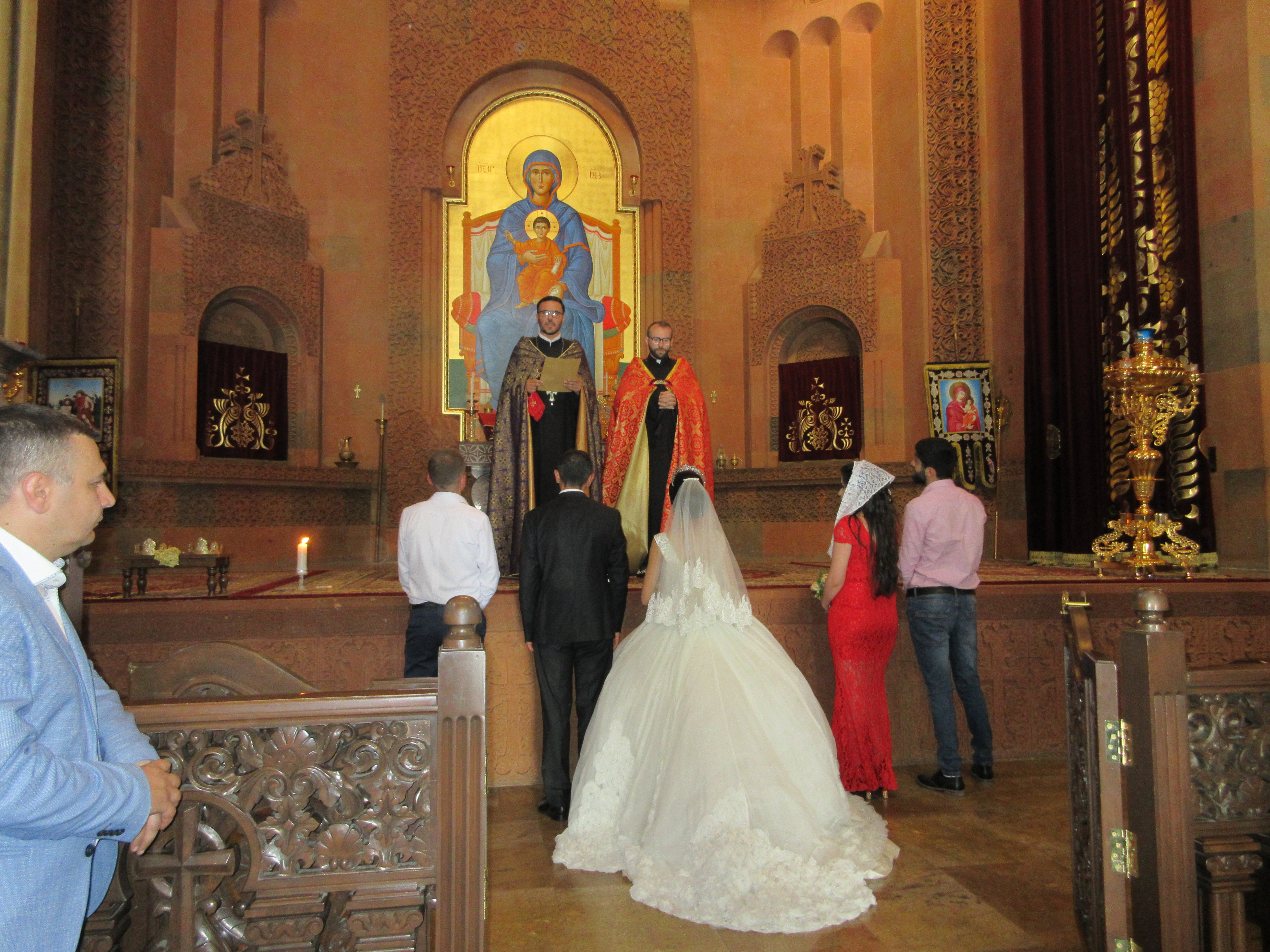 Rev. Fr. Mesrop Ash from St. John Armenian Apostolic Church in San Francisco, Mer Hooys board member, joined the parish priest of St. Hovhaness Armenian Church in Abovyan City performing the traditional Armenian wedding ceremony. Â Judge Krikorian joined Mer Hooys board members Dn. Dr. Varoujan Altebarmakian, Dn. Dr. Barlow Der Mugrdechian, guests from Los Angeles Vahram and Polina Biricik, and Chris and Lucy Yaldezian from San Ramon, Mer Hooys graduates and staff as witnesses to the wedding ceremony.
