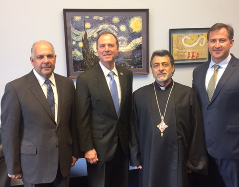 (From L to R) Armenian Assembly of America Co-Chair Anthony Barsamian, Congressman Adam Schiff, Primate, Armenian Assembly of America Executive Director Bryan Ardouny