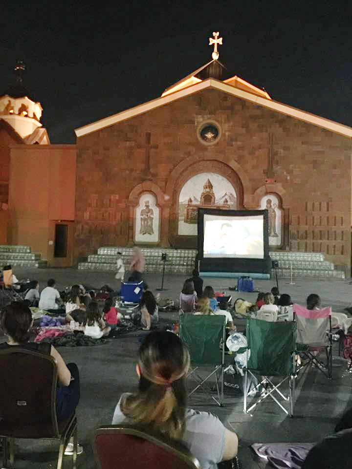 The Turpanjian Plaza of St. Leon Armenian Cathedral was transformed into an outdoor movie theater on Thursday, August 3, 2017. The evening’s feature film was Inside Out, winner of the 2016 Academy Award for best animation.  The crowd enjoyed the cool breeze of the outdoor movie theater and wondrous scenery of the Cathedral’s luminous dome in the night sky.Â