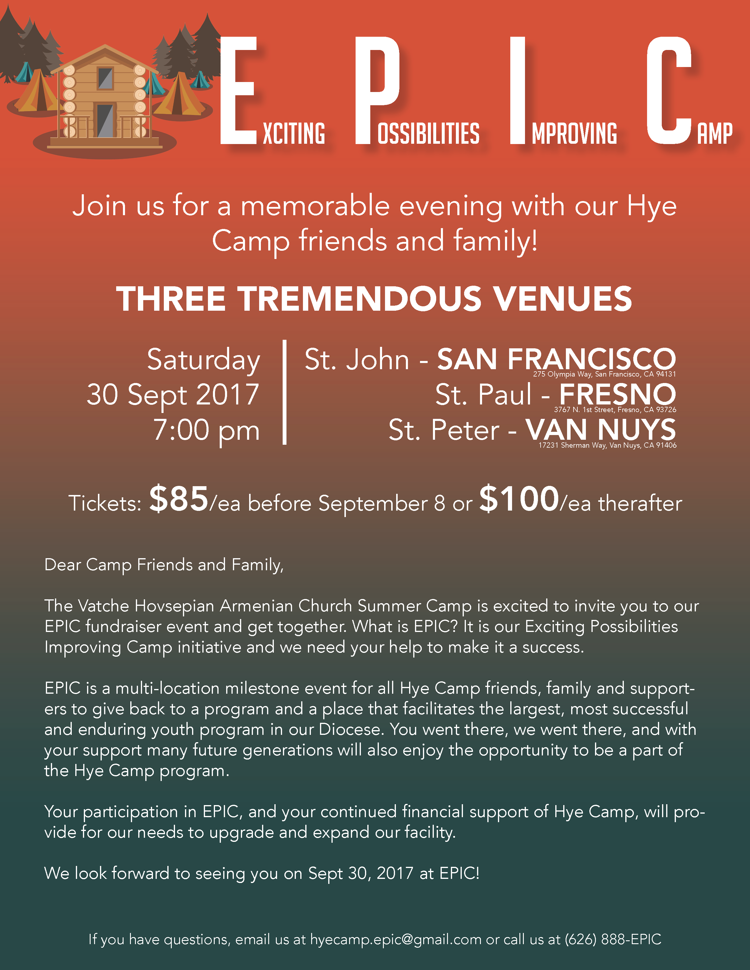 To kick off the start of this exciting phase of the future of the camp facility, the Western Diocese, under the auspices of His Eminence, is announcing the E.P.I.C. (Exciting Possibilities Improving Camp) fundraising campaign, and the E.P.I.C. event on September 30, 2017. This will be a three-location event, held simultaneously at St. Peter Armenian Apostolic Church of Van Nuys, St. Paul Armenian Apostolic Church of Fresno, and St. John Armenian Apostolic Church of San Francisco. The event locations will have food, drinks, entertainment, auction of camp items, and special guests.