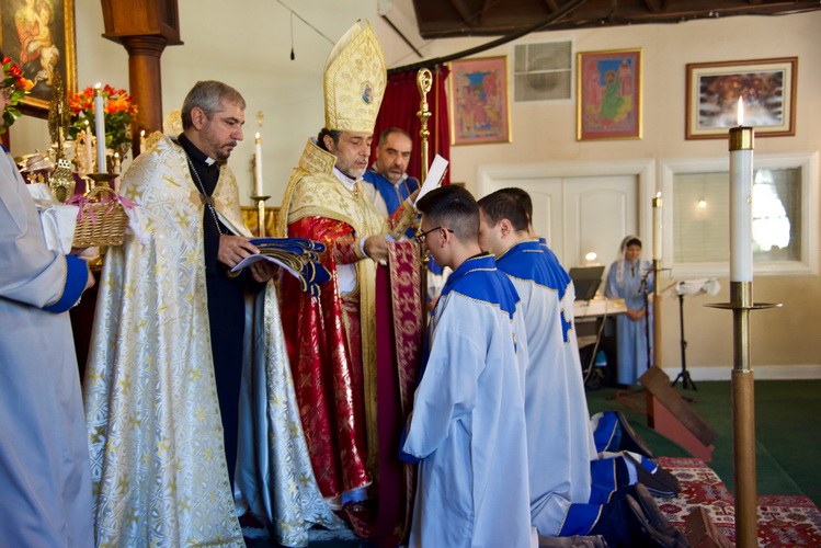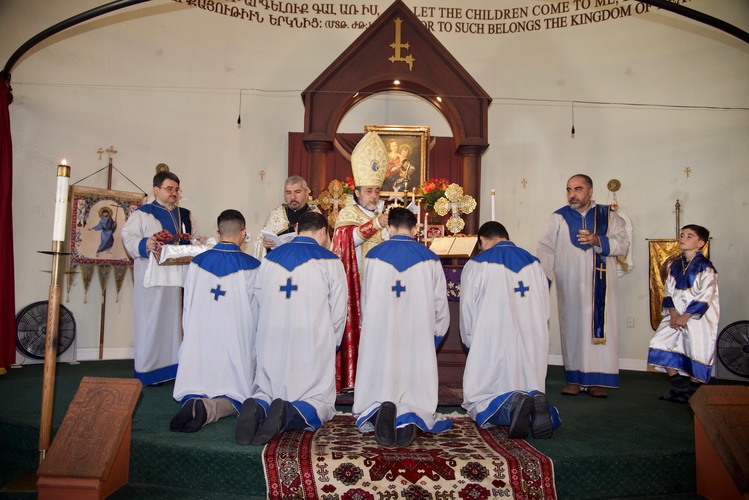 During the service, His Eminence granted four minor orders of acolyte to Tigran Hambardzumyan, Meruzhan Grigoryan, Arees Setrak and Sedrik Ranjbar. Congratulating the newly ordained altar servers, Archbishop Derderian encouraged the young men to serve Christ, our Lord, with renewed dedication and zeal and to serve the Armenian Apostolic Church with humility, loyalty and grace.