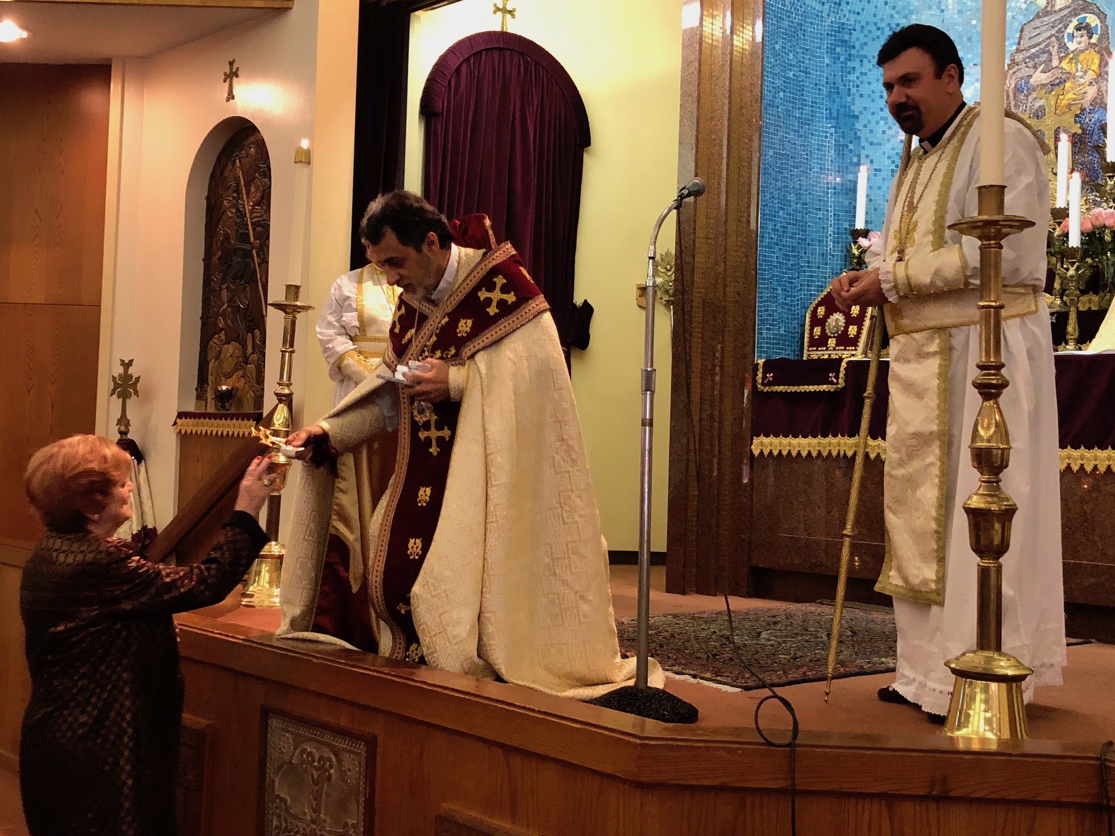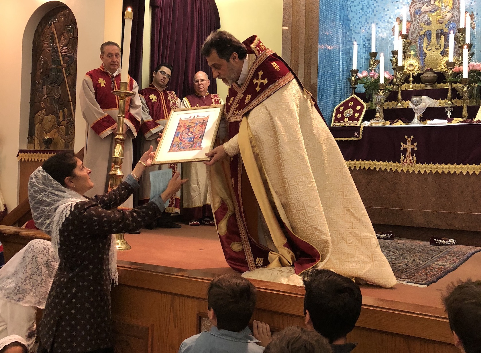 Assisting the Primate at the Holy Altar were the Rev. Fr. Haroutioun Tachejian, Pastor of the host parish and the Rev. Fr. Vazken Movsesian and the deacons of the St. James parish. During the service, Archbishop Derderian recognized the Sunday School students and encouraged the youth to remain steadfast and further their Christian education with renewed zeal. Recently published prayer books by the Western Diocese were distributed to the students. The Sunday School’s superintendent and Christian Education Council Chairlady Mrs. Gail Chelebian was also honored by the Primate for her dedication and selfless service. As a token of his gratitude, the Primate presented an icon to Mrs. Chelebian.