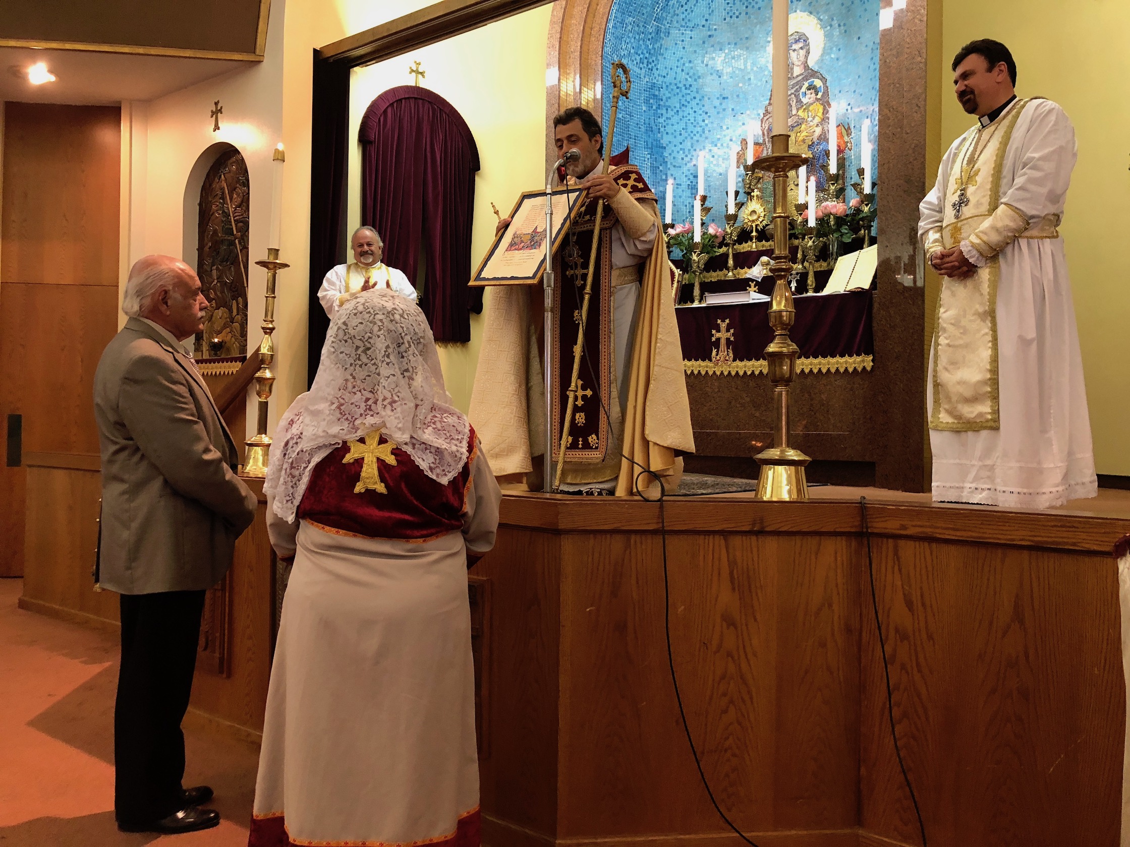 In celebration of their 50th wedding anniversary, long-time parishioners and Diocesan donors Mr. and Mrs. Robert and Arpi Barsam were recognized by the Primate, who presented them an icon and expressed his gratitude to the couple for their decades of selfless service rendered to the St. James Parish and the Western Diocese.