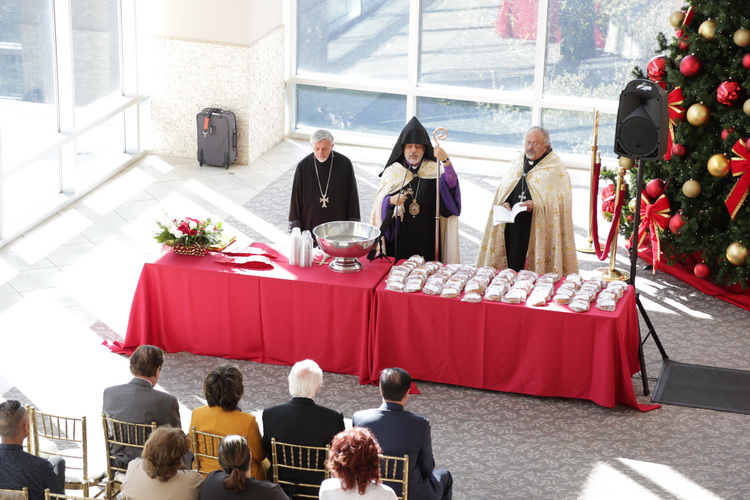 Dozens including hospital staff, local officials, members of law enforcement and patients, gathered in the west lobby of Glendale Adventist Medical Center on Friday, January 5, 2018 as Archbishop Hovnan Derderian, Primate of the Western Diocese of the Armenian Church of North America performed the Blessing of the Water Service. Archbishop Derderian was accompanied by Archpriest Fr. Hovsep Hagopian and the Rev. Fr. Vazken Movsesian.
