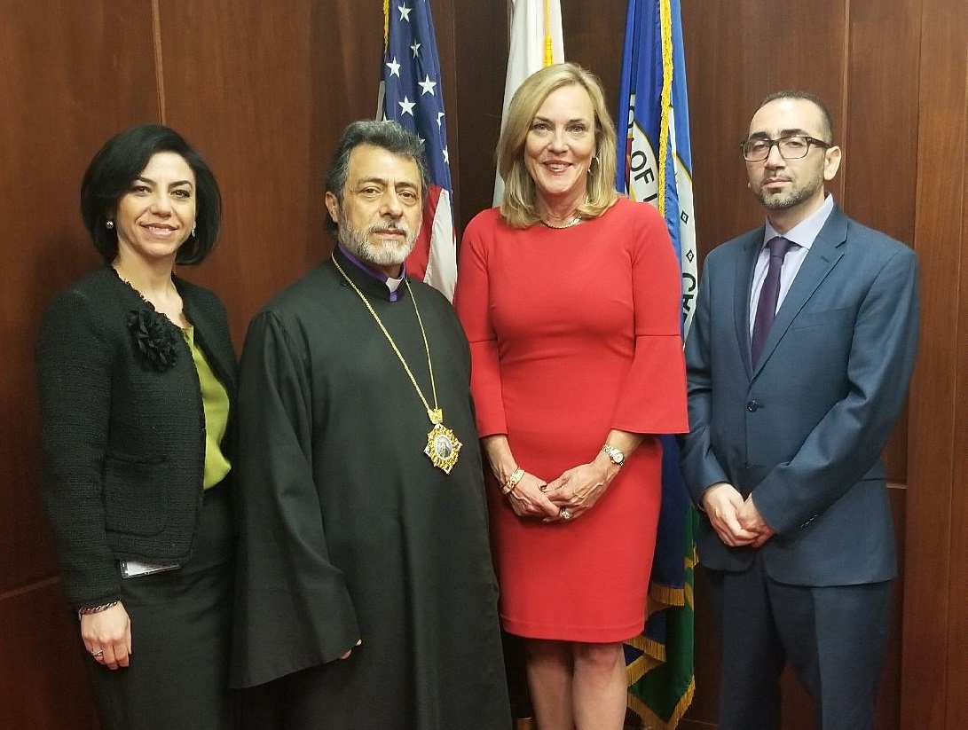 On February 1, 2018, the Diocesan Primate met with Los Angeles County Supervisor Kathryn Barger. The Diocesan Primate was accompanied by Harout Markarian, Executive Director of the Western Diocese. Ms. Anna Mouradian, Chief Deputy of Supervisor Barger also participated in the meeting. His Eminence expressed his gratitude to Supervisor Barger for attending the celebration of the Divine Liturgy at St. Leon Armenian Cathedral on the Feast of the Nativity and Theophany.