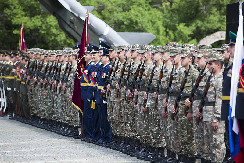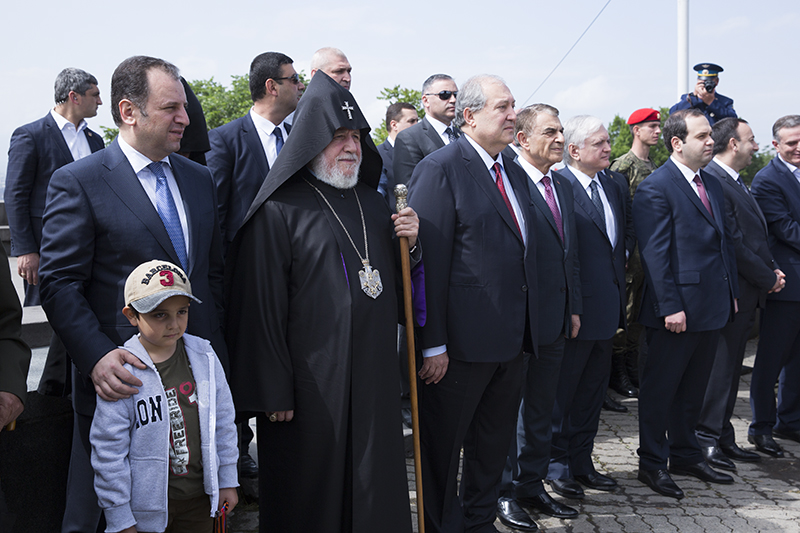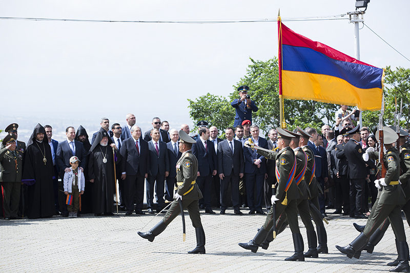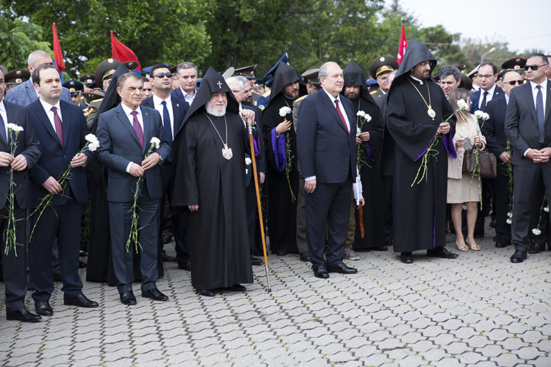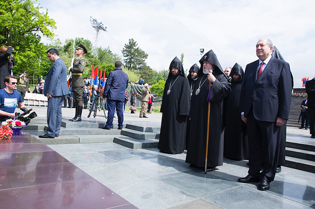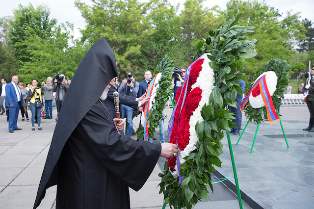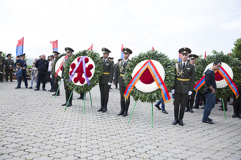 Անյայտ զինուորի յուշարձանին ծաղկեպսակներ զետեղելուց յետոյ Գարեգին Բ. Վեհափառ Հայրապետը, Հայաստանի Հանրապետութեան նախագահ Արմէն Սարգսեանը եւ ՀՀ Ազգային ժողովի նախագահ Արա Բաբլոյեանը, պետական այրերը, ՀՀ-ում հաւատարմագրուած դիւանագիտական ներկայացուցչութիւնների ղեկավարներ ու հասարակական գործիչներ յարգանքի տուրք մատուցեցին Հայրենական մեծ պատերազմում եւ Արցախեան հերոսամարտում զոհուածների անմահ յիշտատակին:
