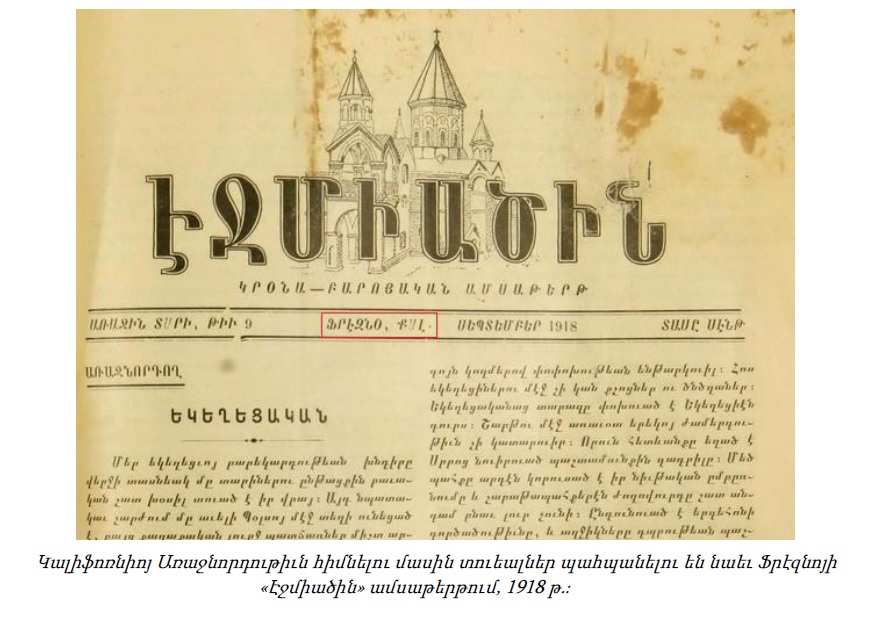 Բոլոր այս գրագրութիւններն ու փաստաթղթերը յուշում են, որ 1918 թ. ապրիլի 8-ին Ս. Էջմիածնի երեսփոխանական ժողովը քննարկել, քուէարկել եւ միաձայն համաձայնութիւն է տուել Կալիֆոռնիայի առանձին թեմ եւ առաջնորդութիւն հիմնադրելու մասին։ Որոշման իրագործումը թերեւս ձգձգուել է Հայաստանում պատմական աննպաստ ընթացքի պատճառով։