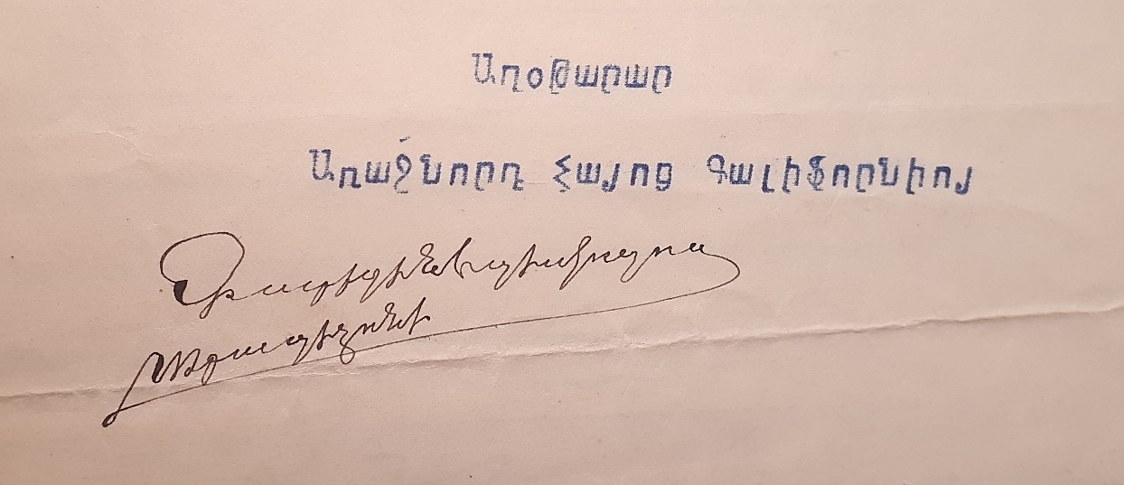 Ամենայն Հայոց կաթողիկոսի դիւանից հրապարակուած փաստաթղթերը յուշում են, որ Նորին Ս. Օծութիւնը դեռևս 1917 թ. փետրուարի 11-ին ստացել է զեկուցագիրը պատգամաւորութեան անունից, ապա ԱՄՆ հայոց առաջնորդ գեր. Տ. Արսէն Ծայր Վրդ.ի անունով կարգադրել հետեւեալը. (կարգադրութիւնը Ս. Էջմիածնի դիւանից մամուլում հրապարակել է Տիրայր եպս.-ը, որ այն ժամանակ դիւանապետն էր Ս. Աթոռում, որ նաեւ յետագայում փոխադրուեց ԱՄՆ եւ երկար տարիներ գործուն հոգեւորականներից մէկը եղաւ - Ն. Պ.)։