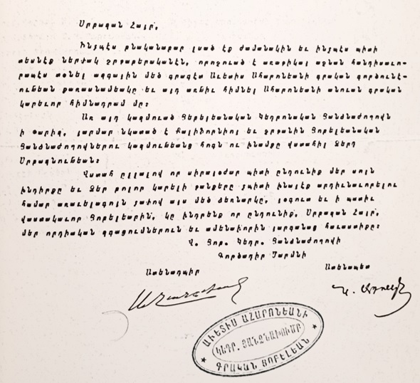 Շնորհակալութիւն կը յայտնեմ այս առթիւ ինձ վստահեցուած պաշտօնին համար եւ կատարեալ յաջողութիւն կը մաղթեմ ձեր ազգօգուտ ջանքերուն։ Մնամ յարգանօք՝ Վ. Մ. Քիւրքճեան»։